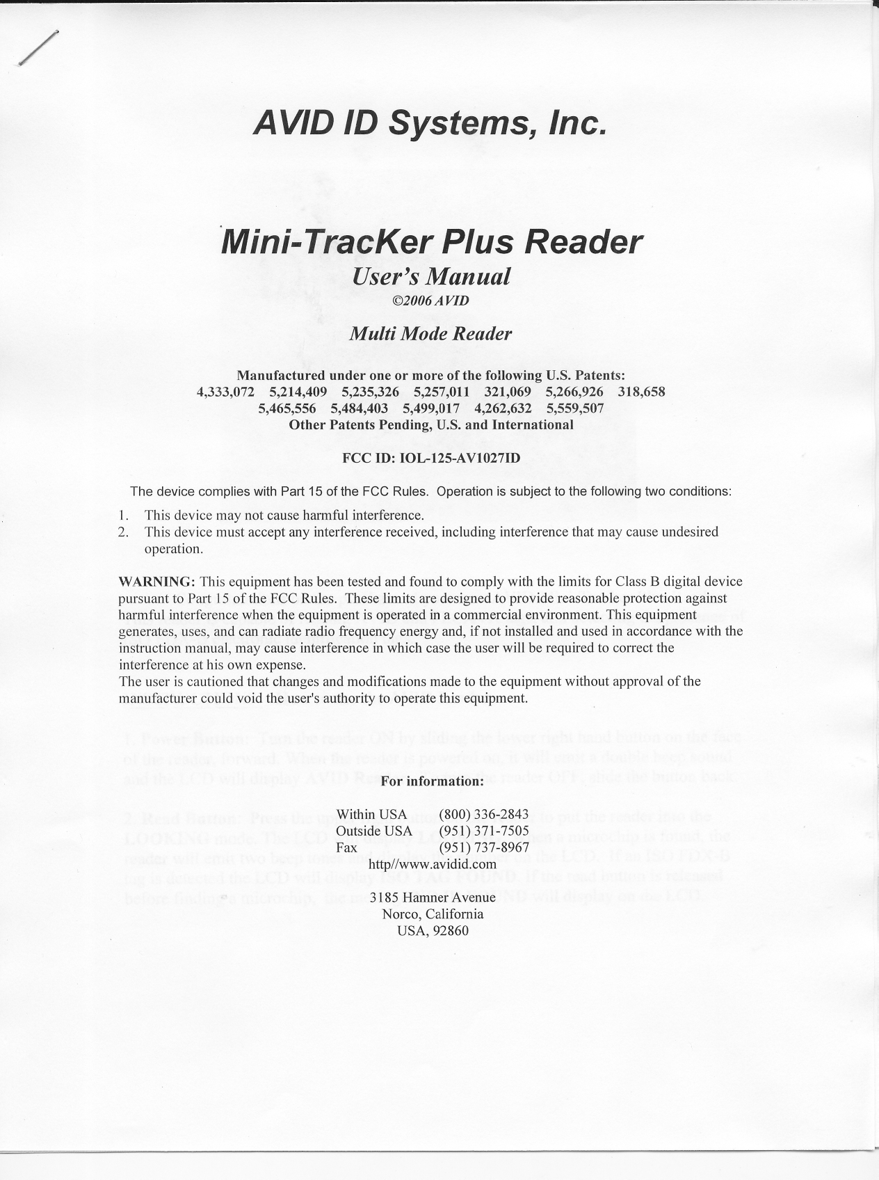 AVID ID Systems, Inc. RF ID Reader Users Manual