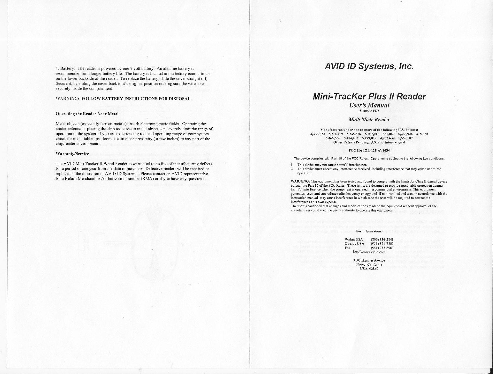 AVID ID Systems, Inc. MiniTracker Plus II Reader Users Manual
