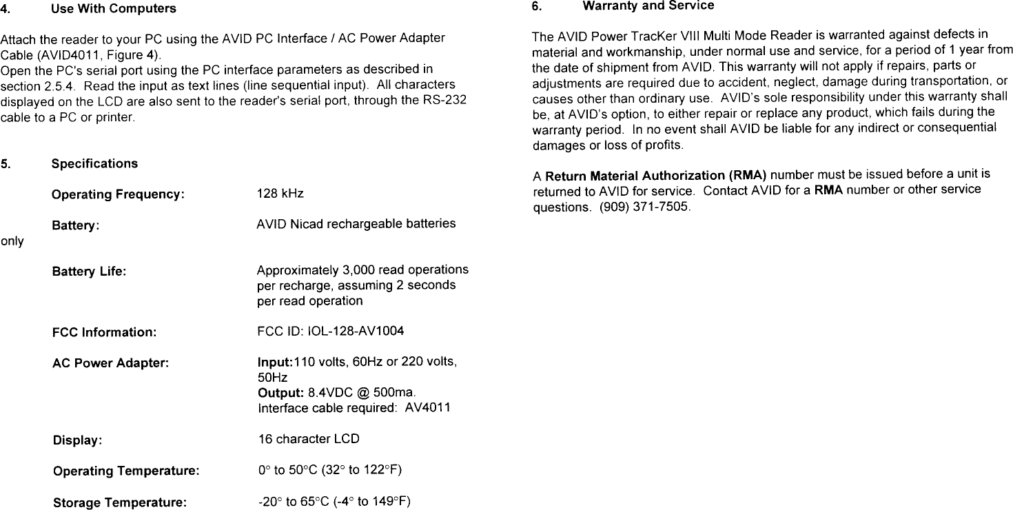 Avid Identification Systems 128-AV1004 Tag Reader User Manual Owners Manual