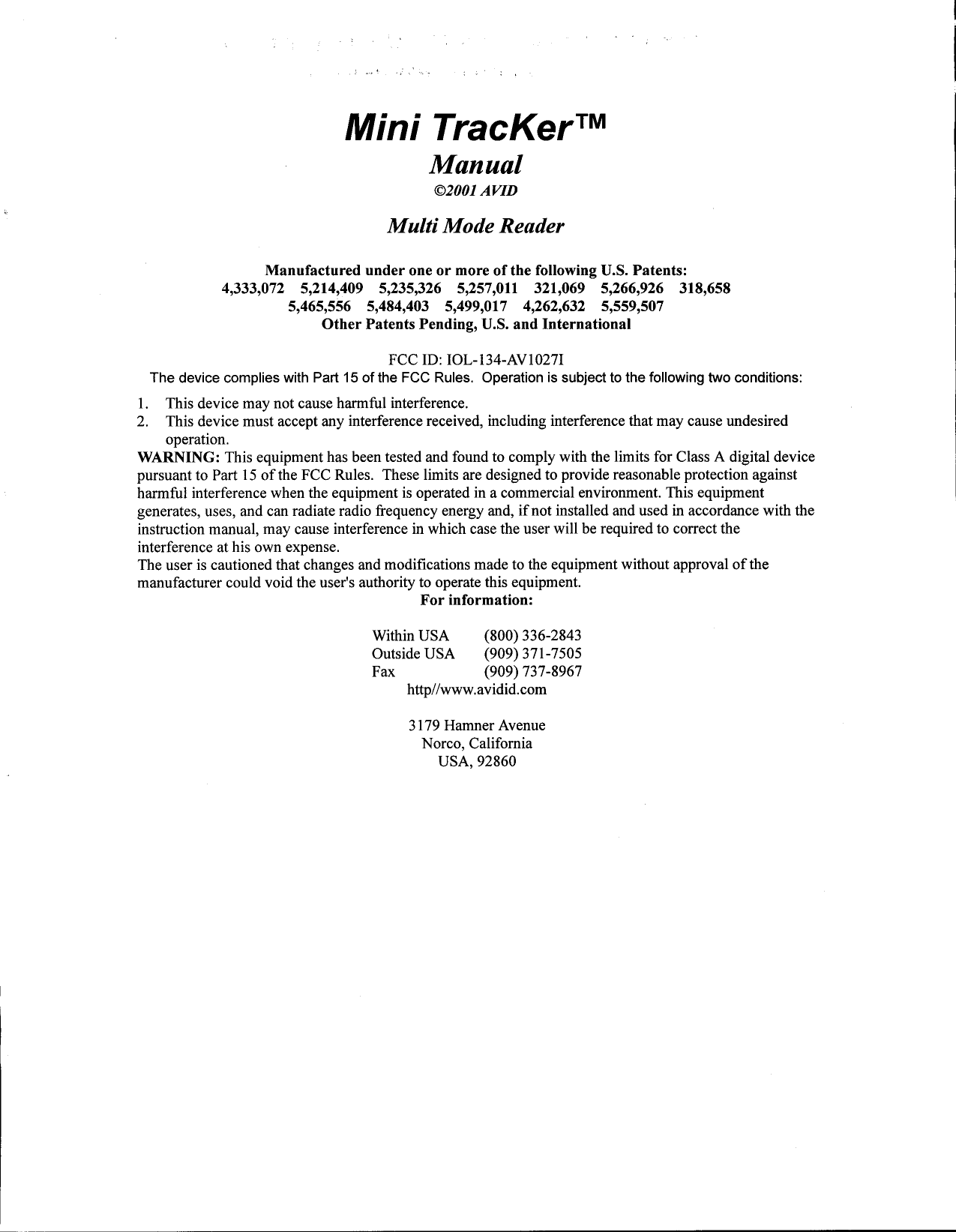 AVID ID Systems, Inc. RF ID Reader Users Manual