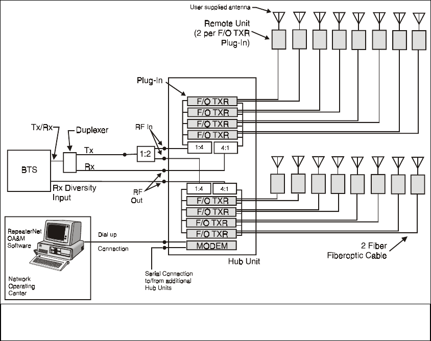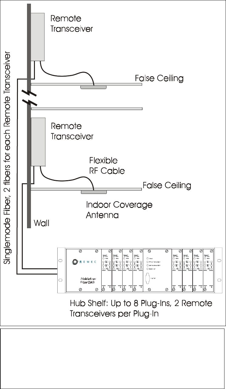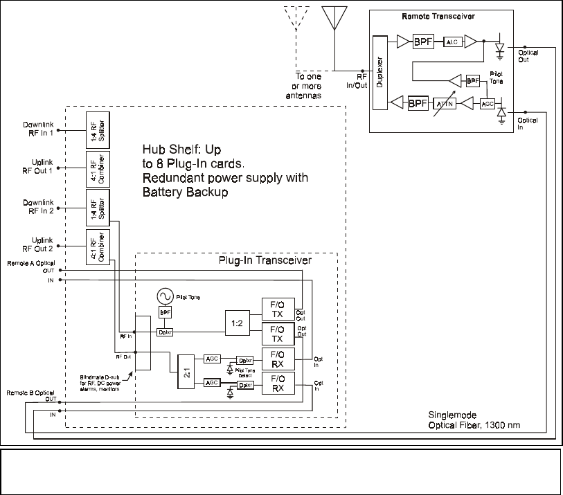 connected to Hub Shelf via two singlemode optical fibers. Each Remote Transceiver has one RF port