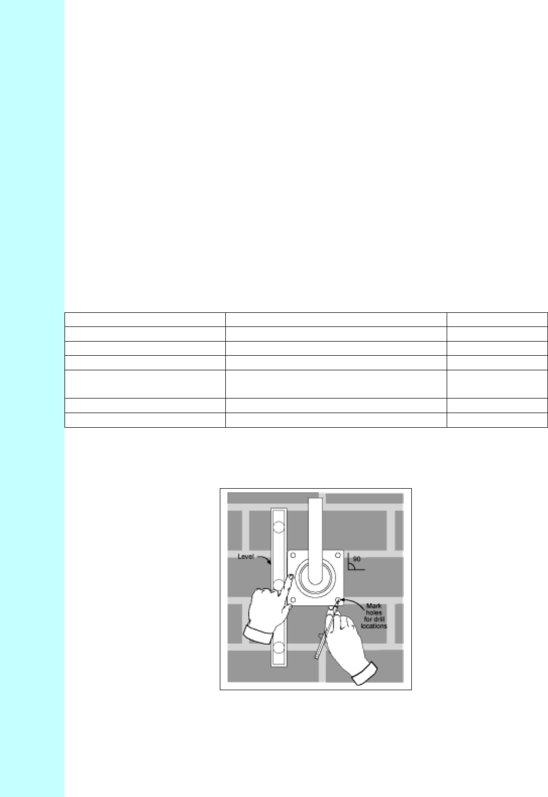 Table 7-1 describes the tools and equipment needed when installing on a brick or masonry wall.