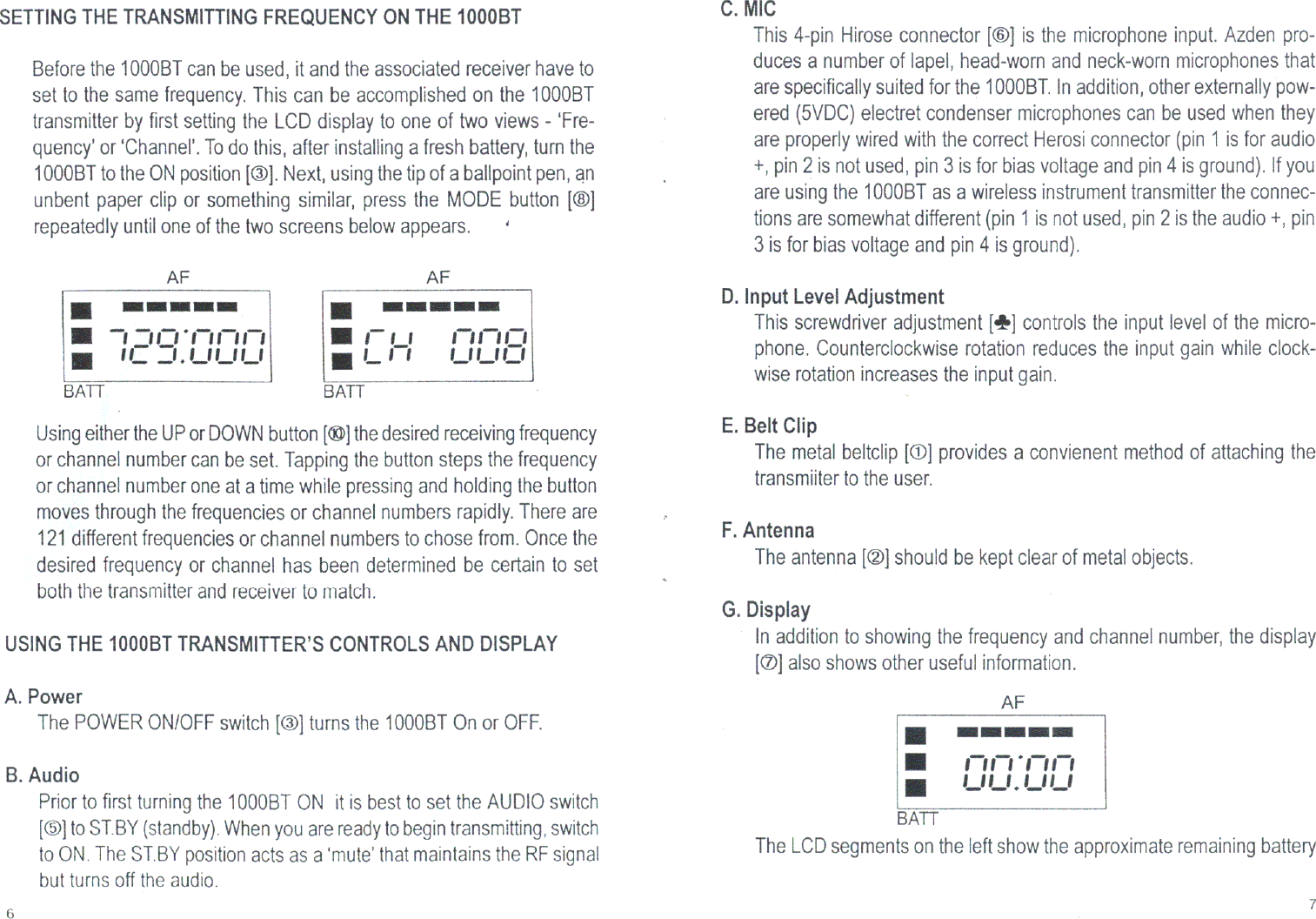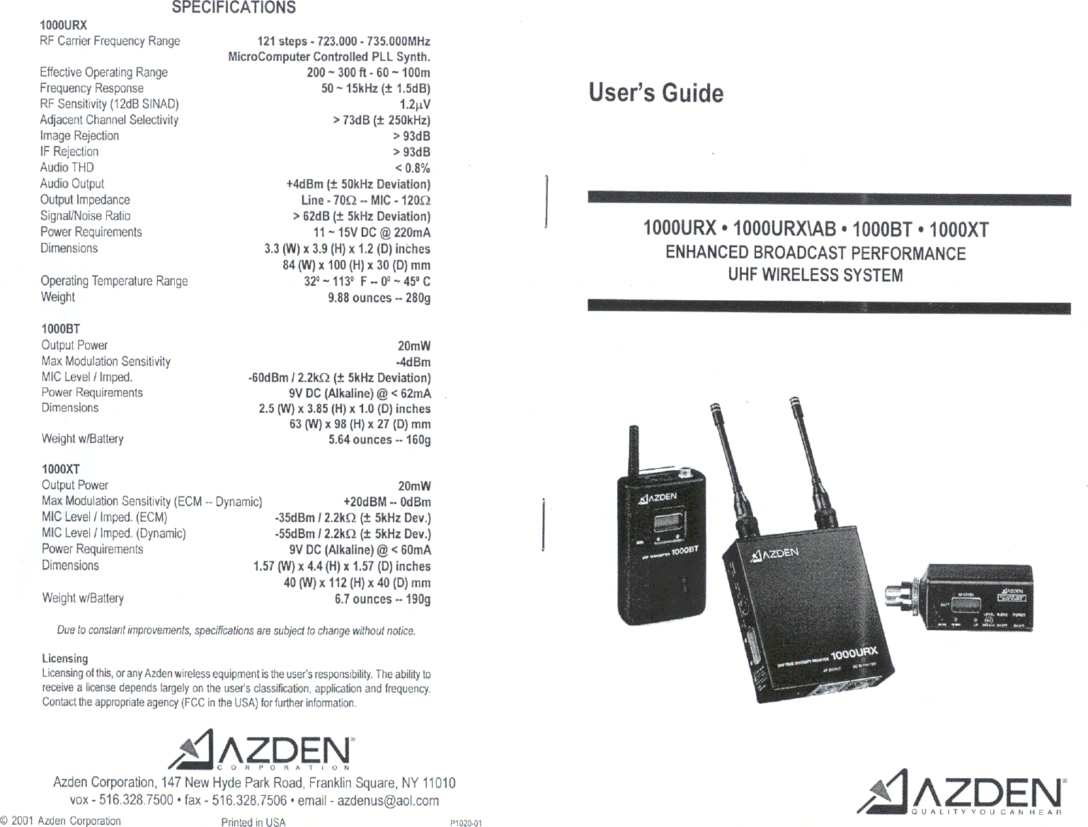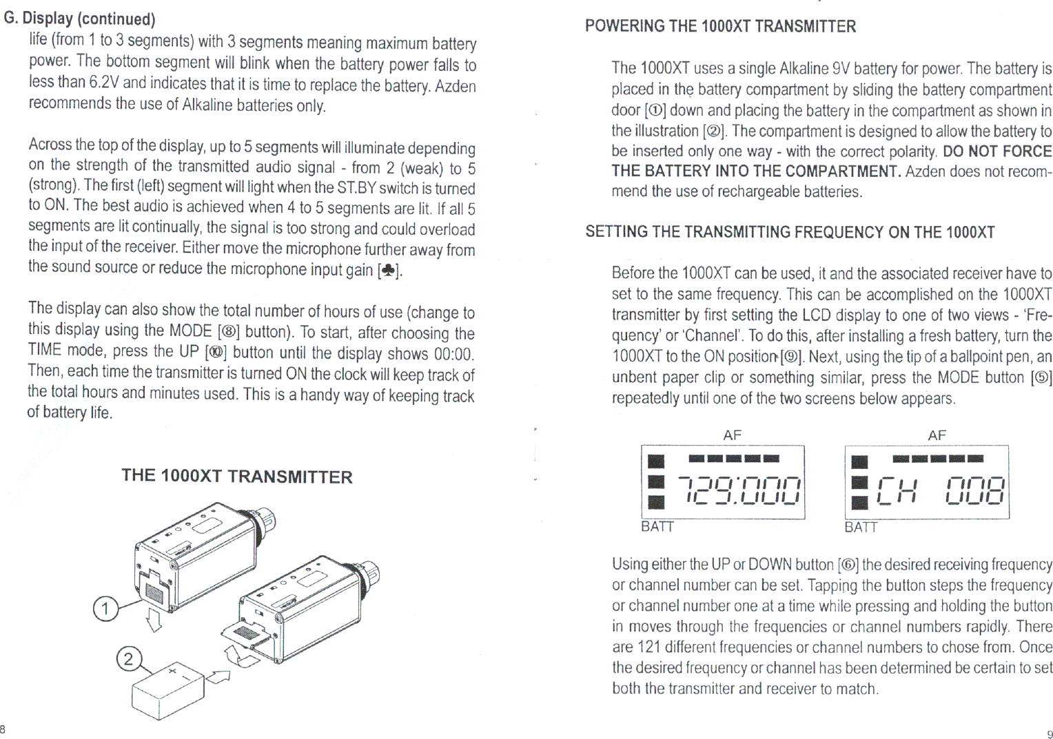 Azden 1000XT Wireless Microphone Transmitter User Manual users manual