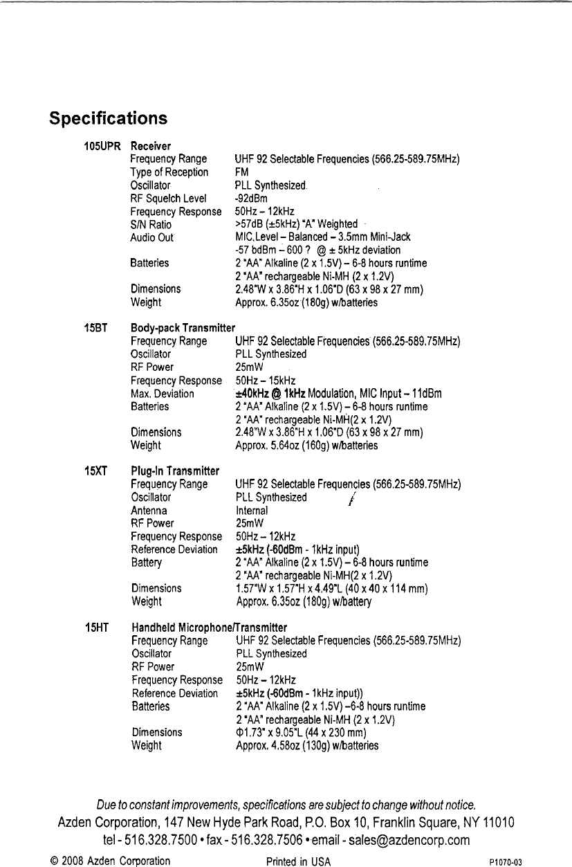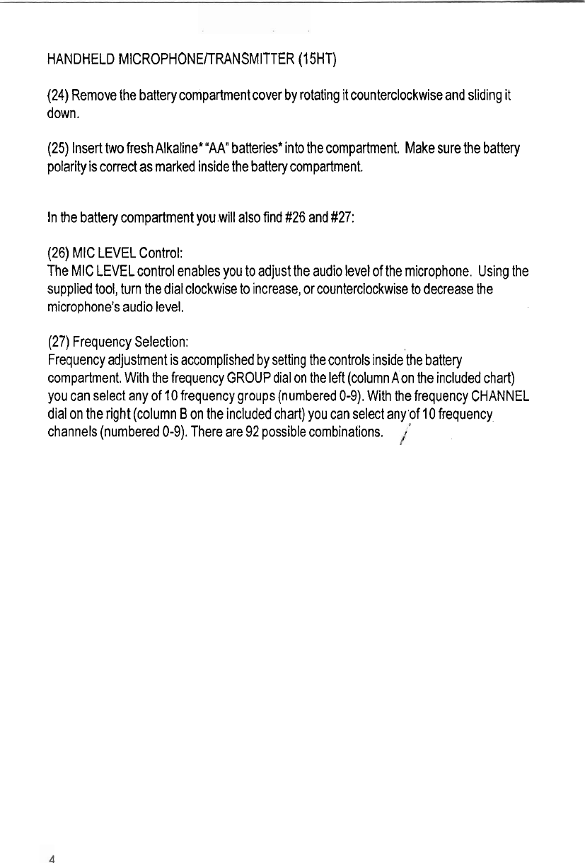 Azden 15XT PLUG IN WIRELESS MICROPHONE TRANSMITTER User Manual USERS MANUAL