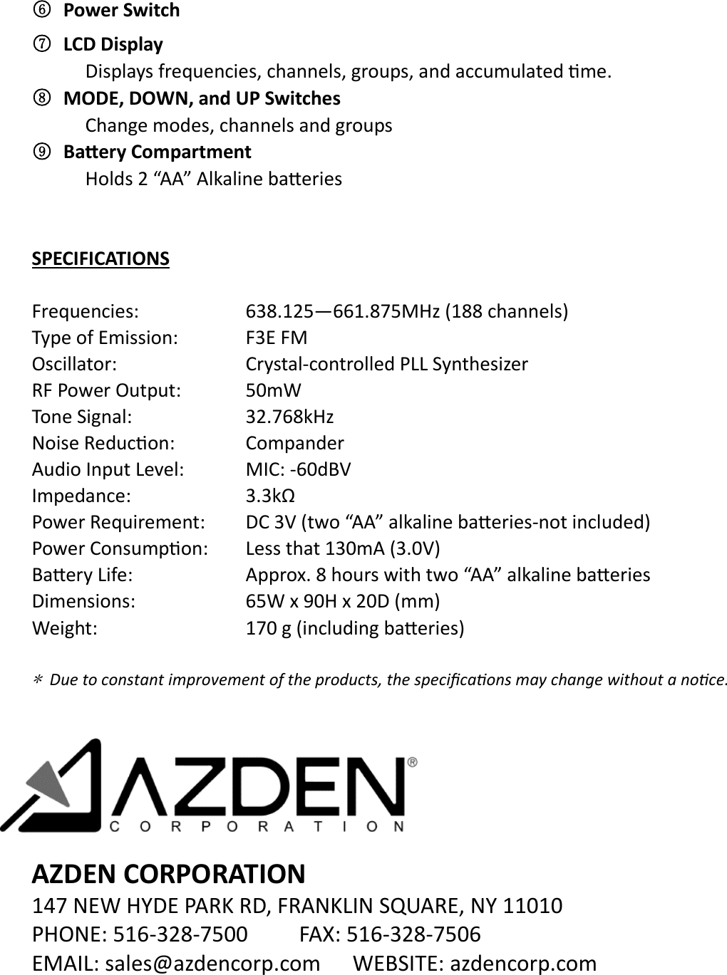 Azden Corporation UHF WIRELESS MICROPHONE Users Manual