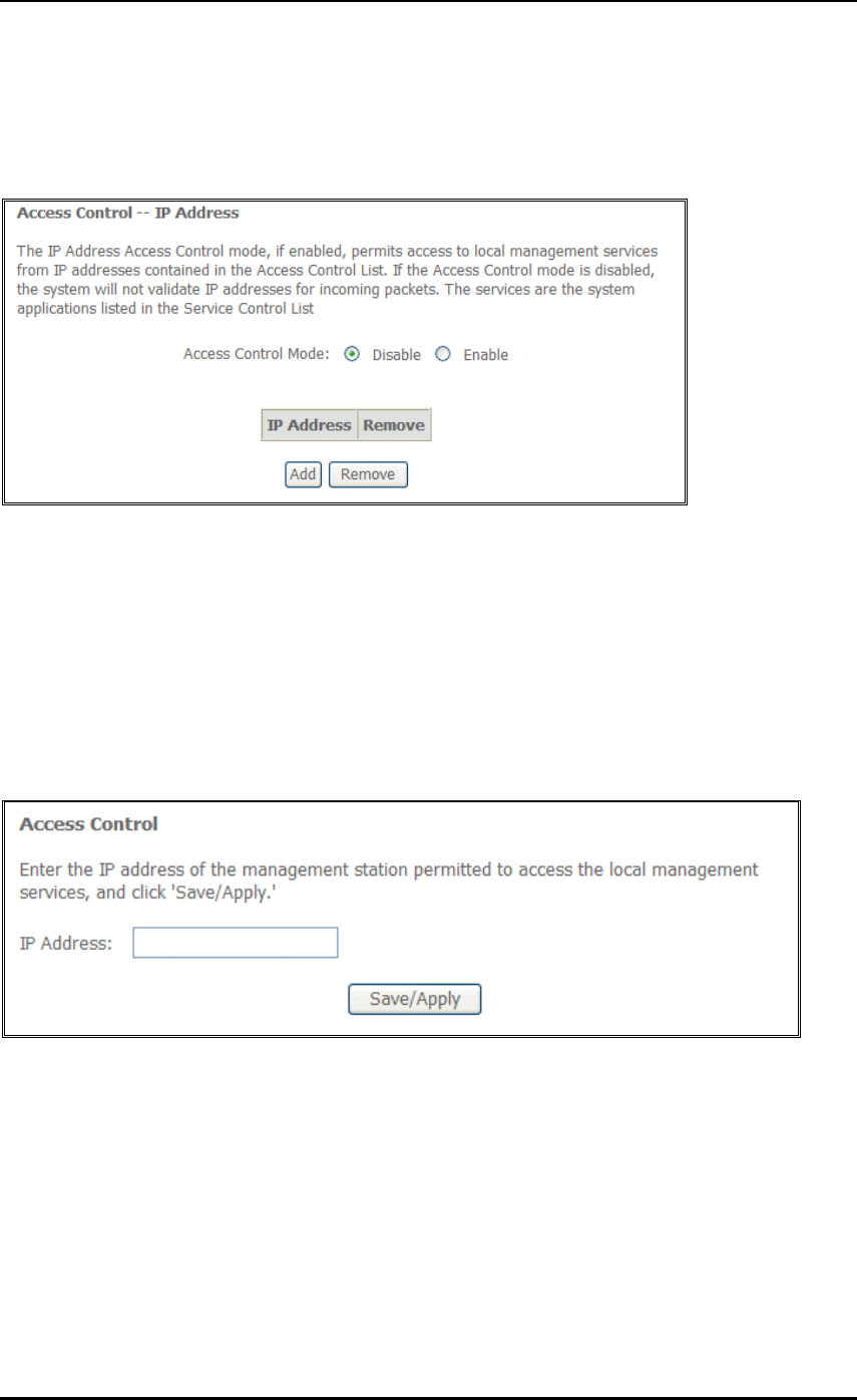To allow remote management based on an authorized IP address, select Enable and click Add.
