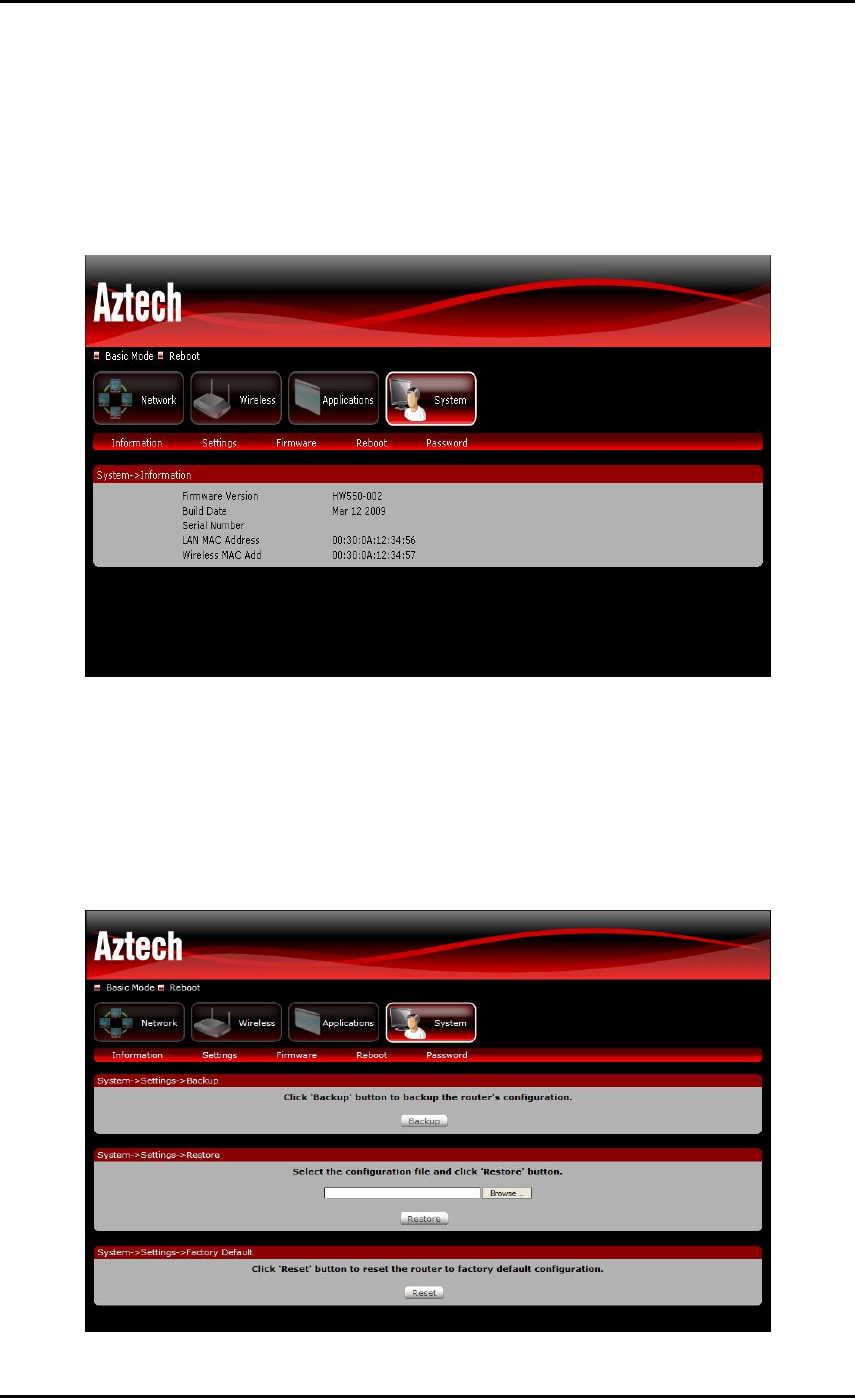 This section allows you to Back up, Save and Restore to factory default the router’s configuration.