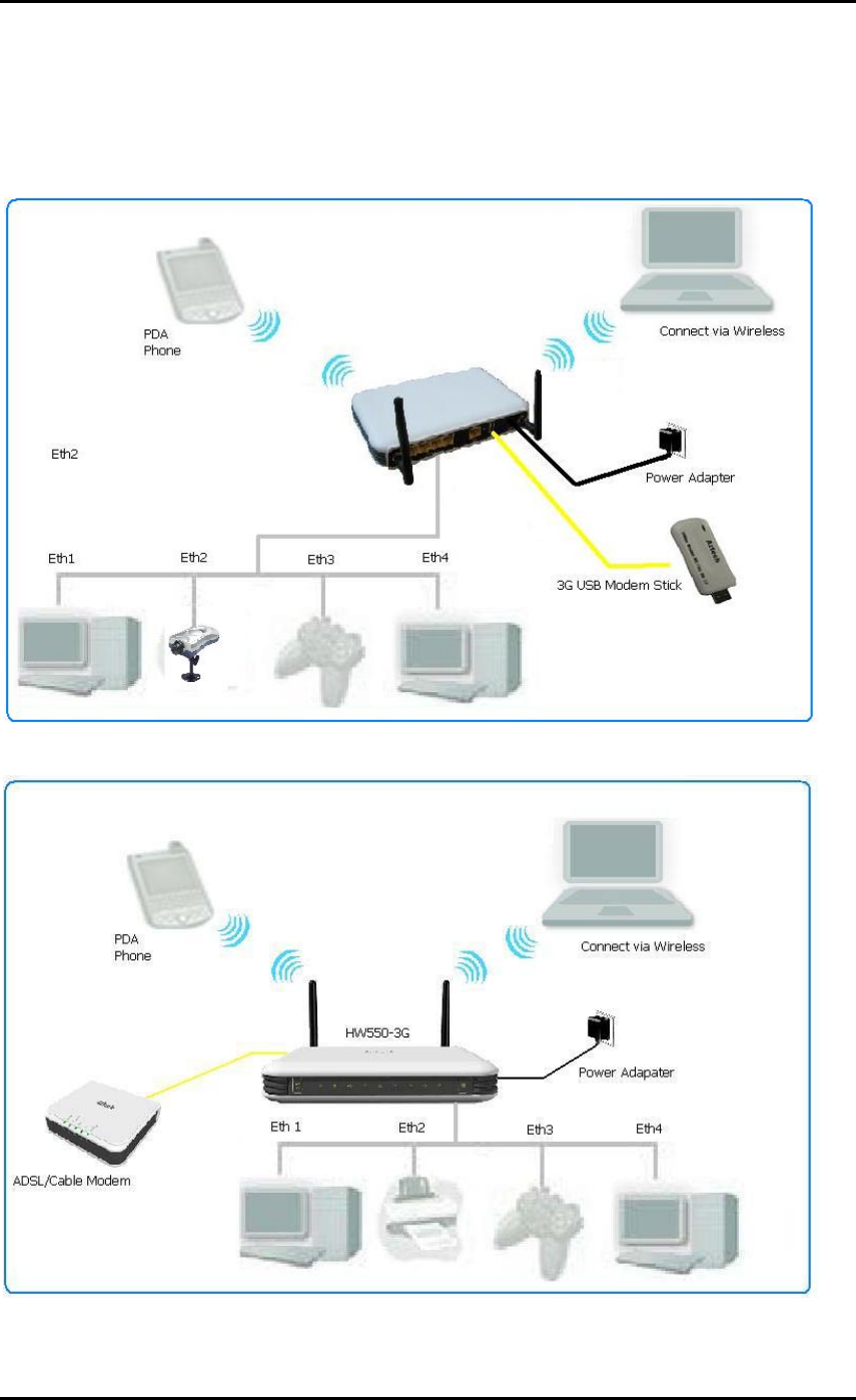 simultaneously. HW550-3G 4-port wireless-N router function provides an excellent solution for sharing a