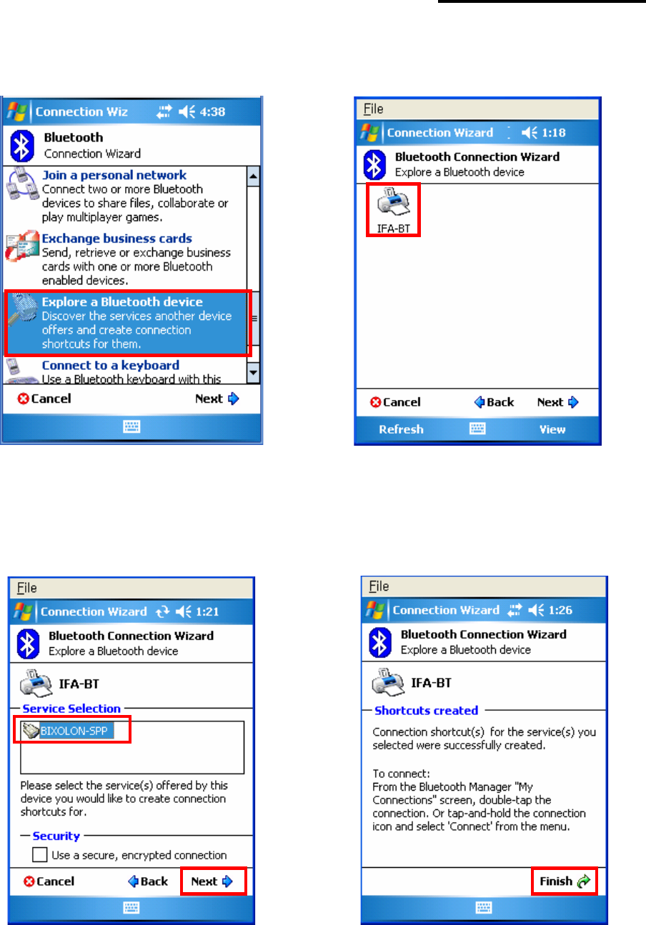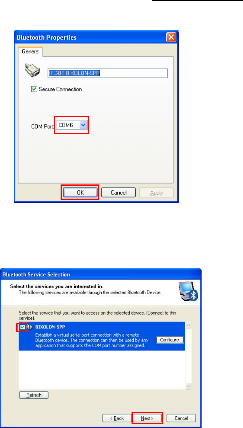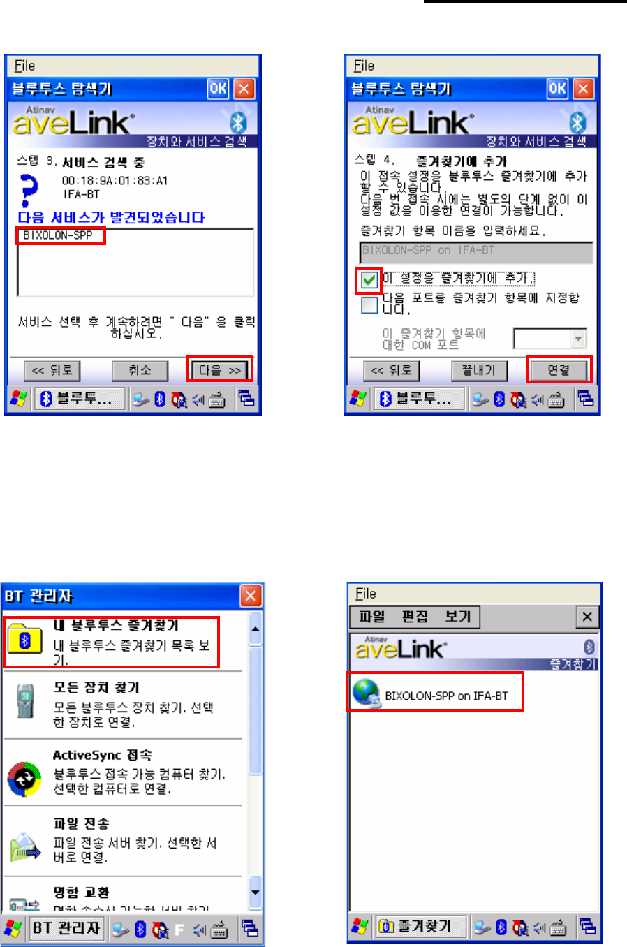 9) Select BIXOLON-SPP and click “Next”. 10) Check favorite and Click “Connect”.
