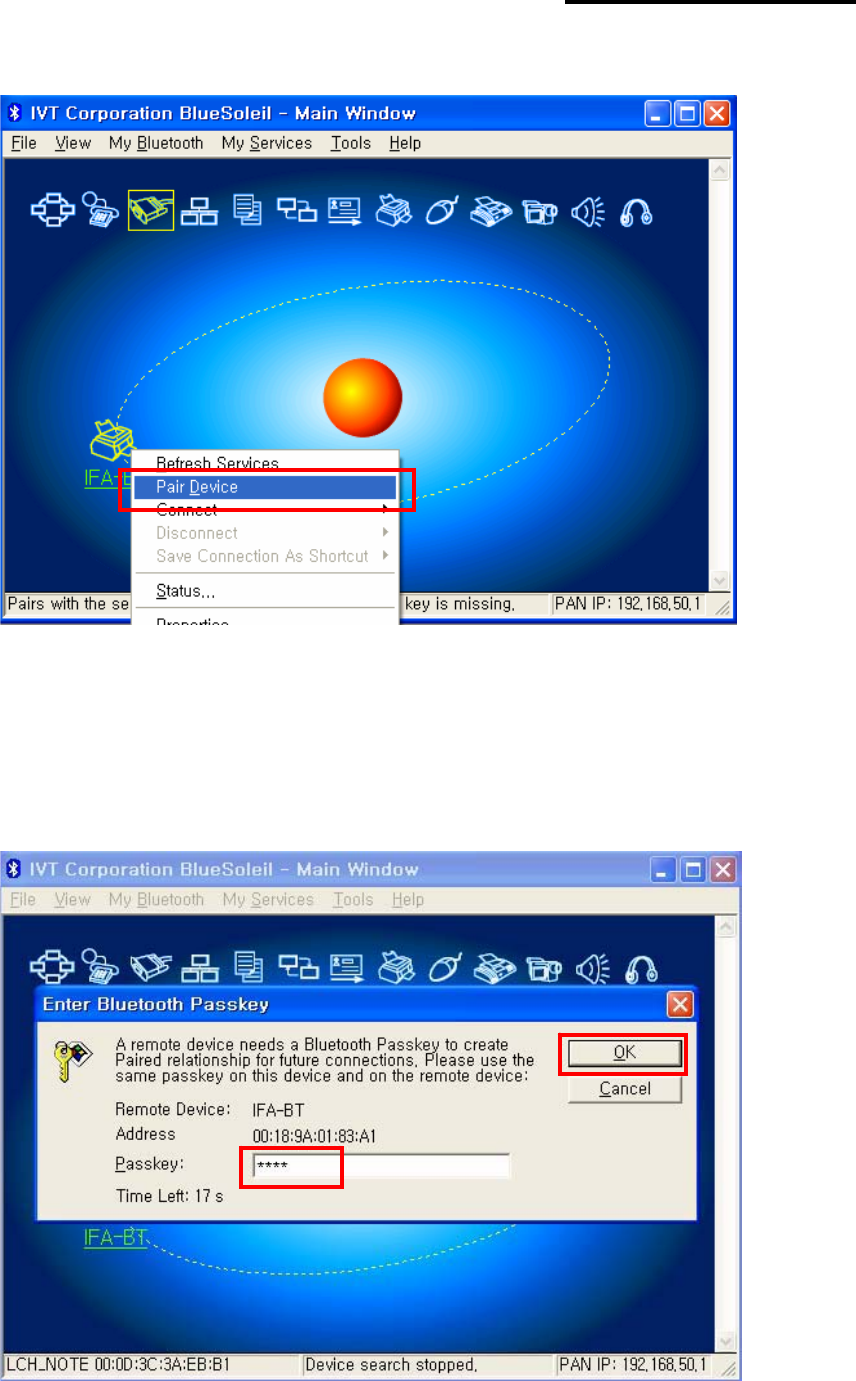 6) Click right button of the mouse above the "IFA-BT Icon" and select the “Pair Device”.