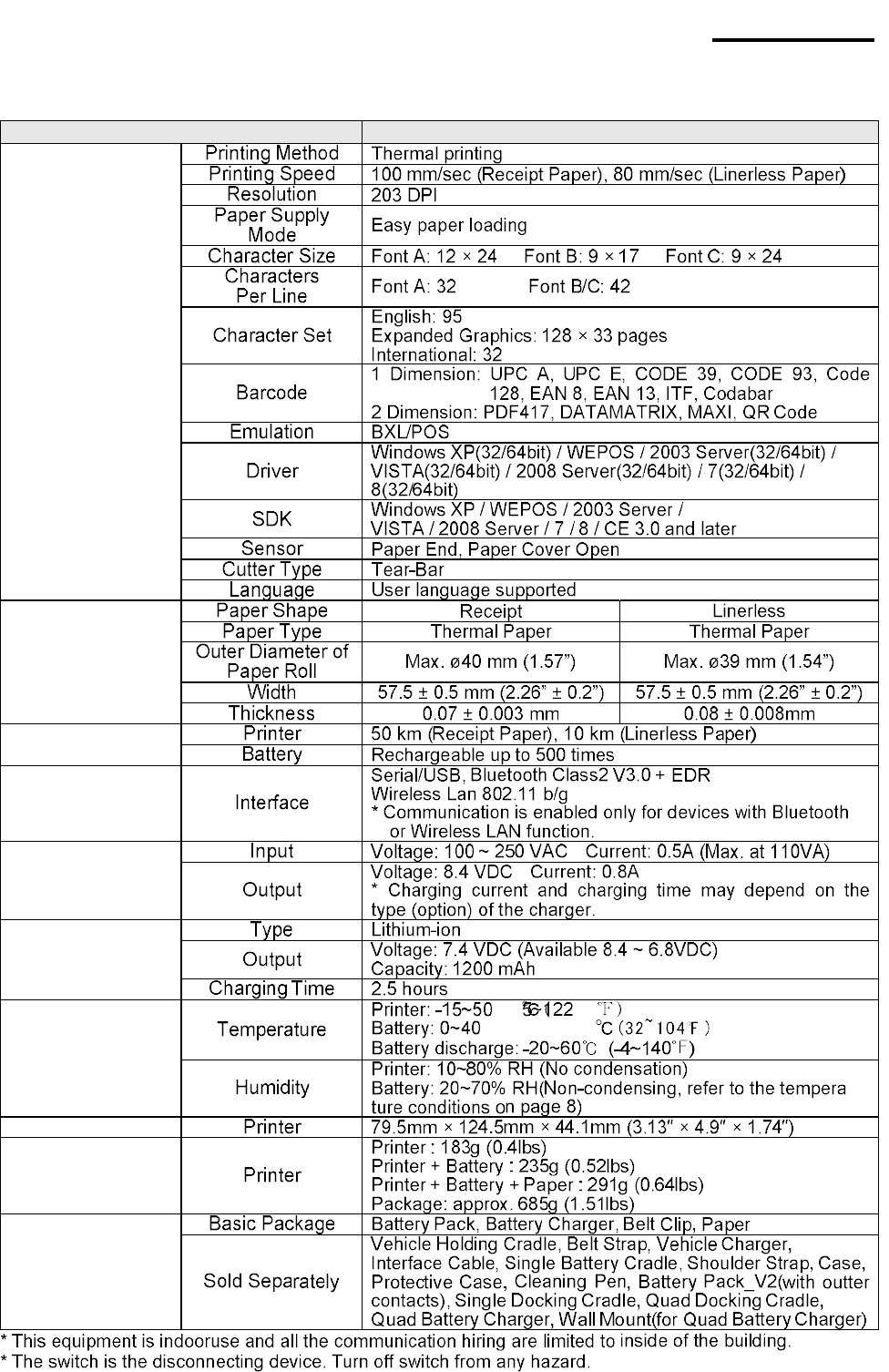 SPP-R200III Battery Pack Battery Charger Paper