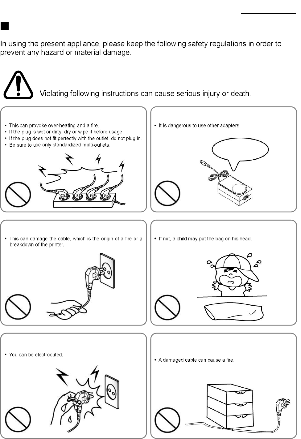 Keep the plastic bag out of children’s reach.Do not pull the cable to unplug.