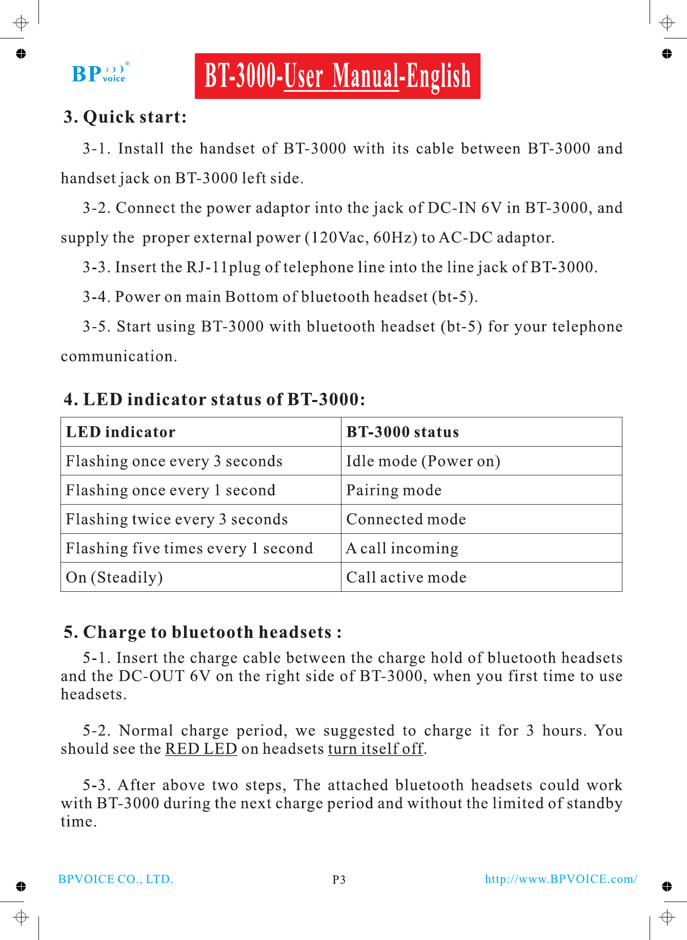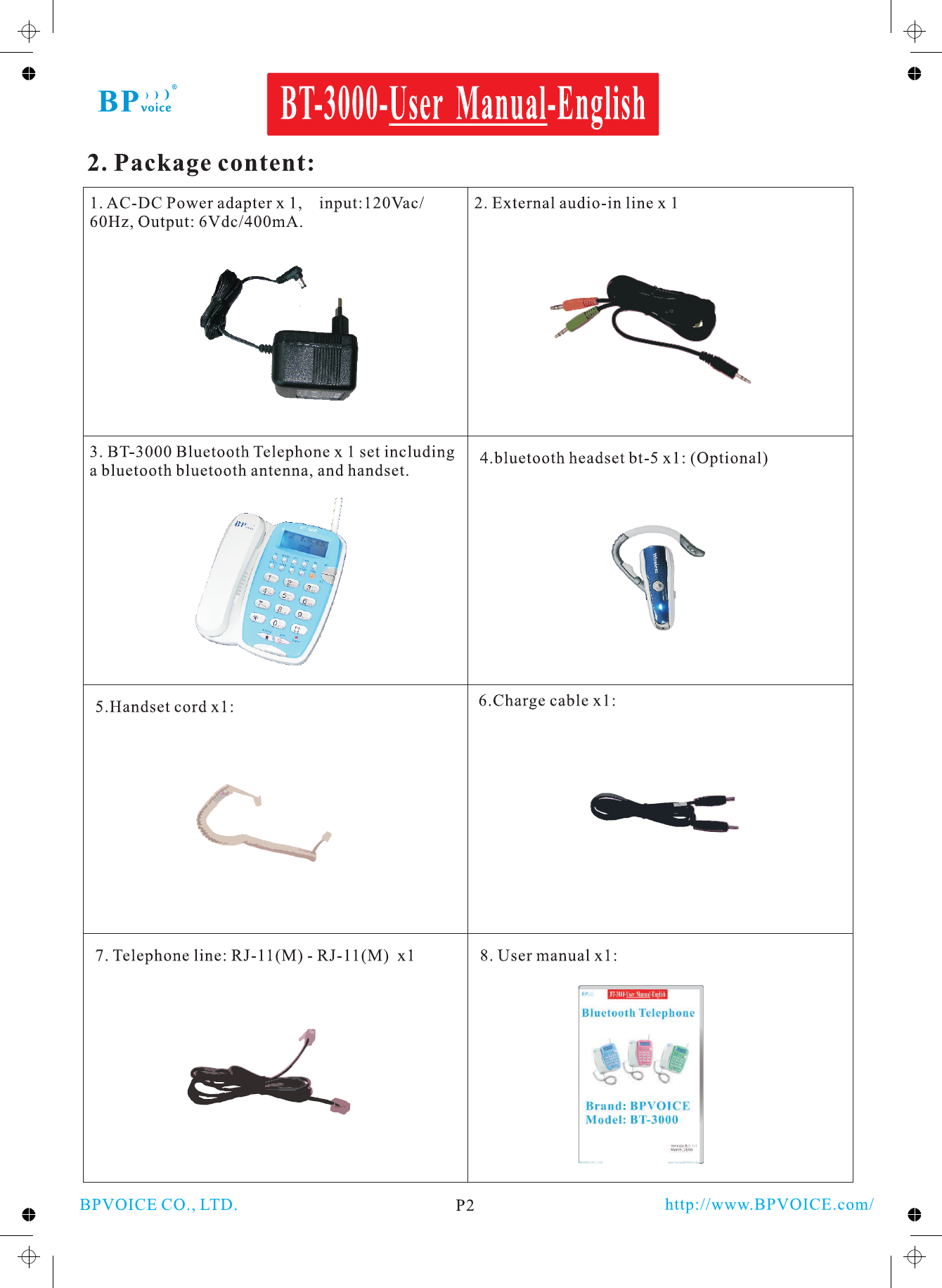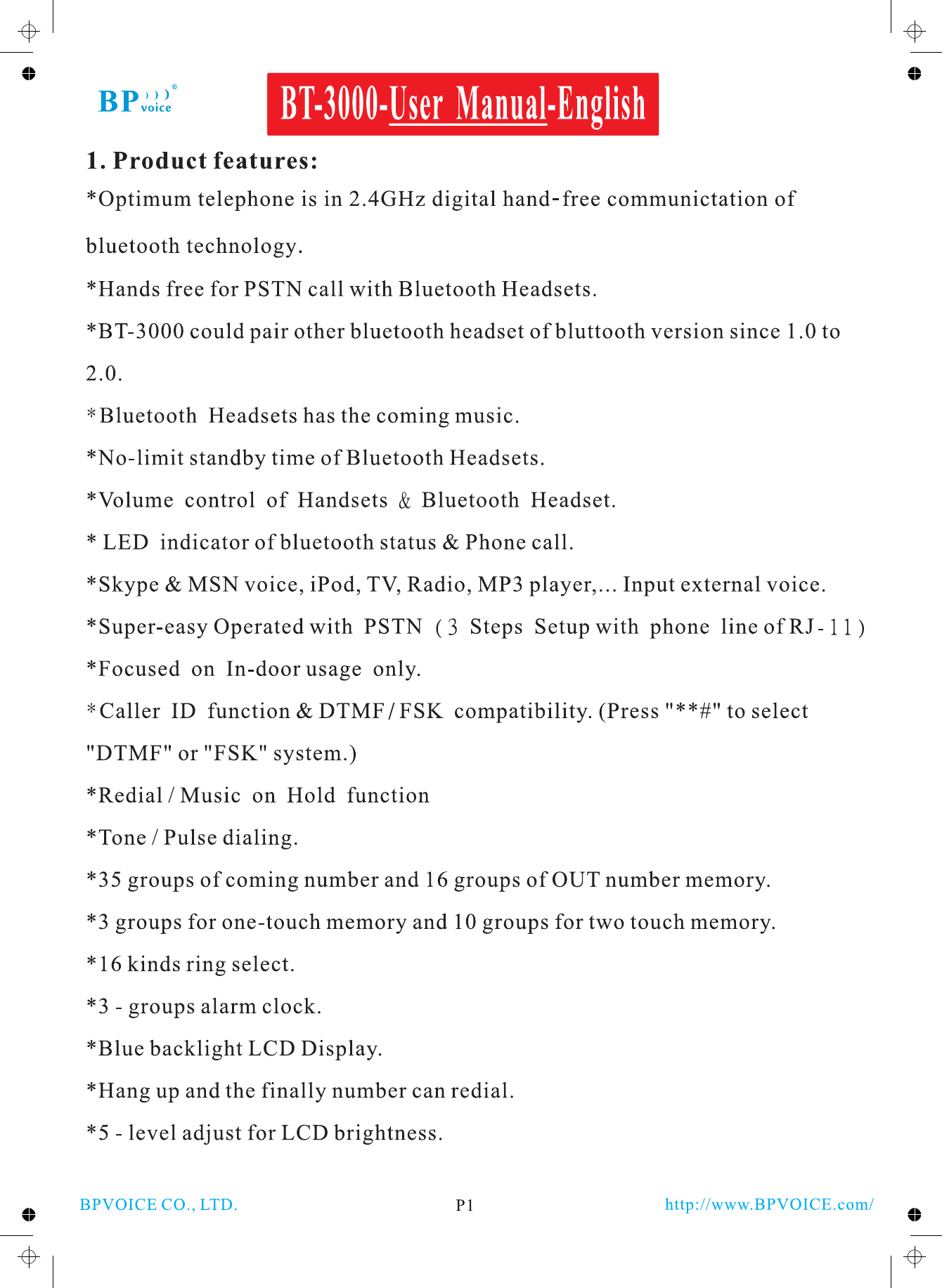 BPVOICE BT-3000 Bluetooth Telephone User Manual