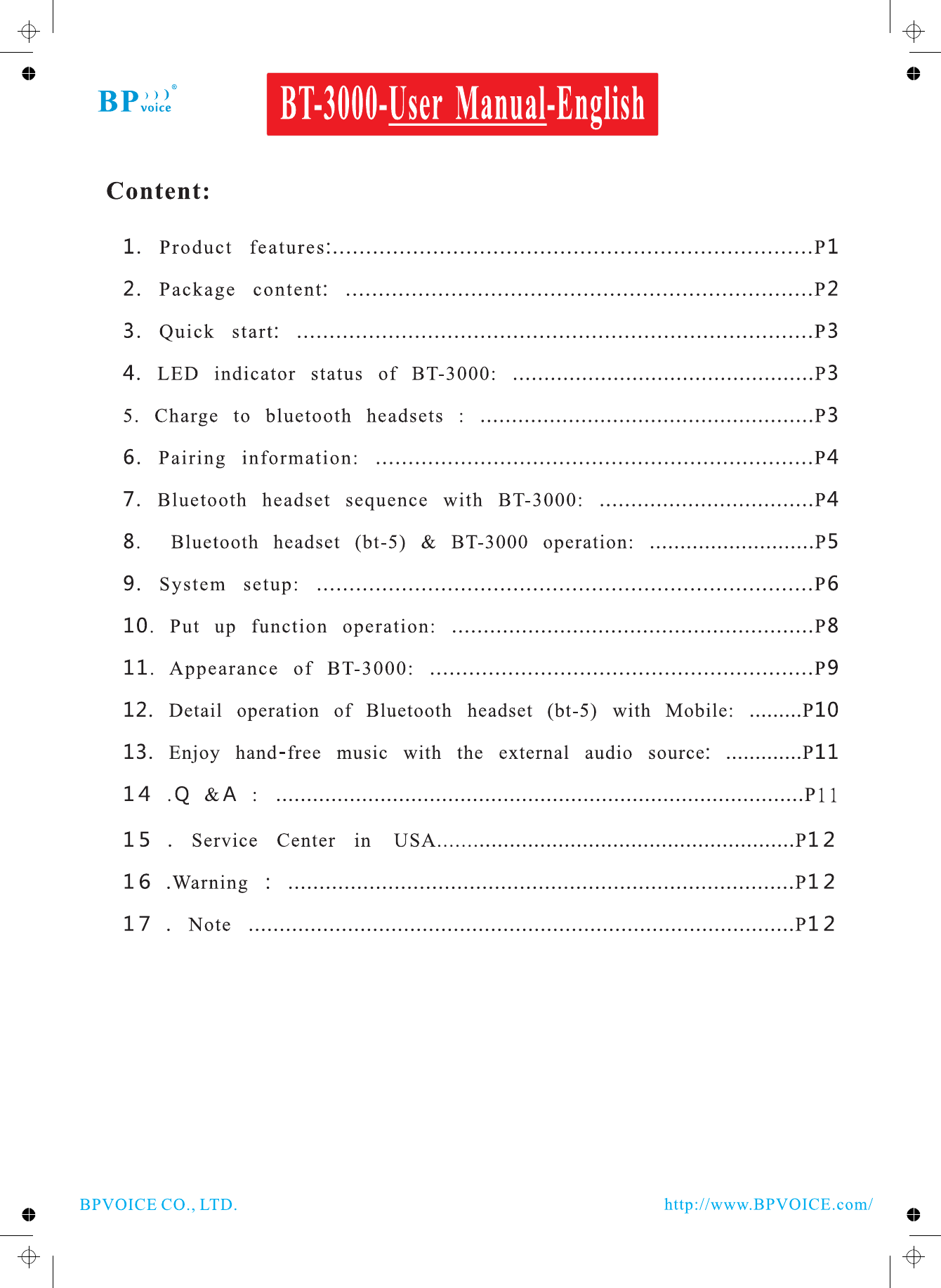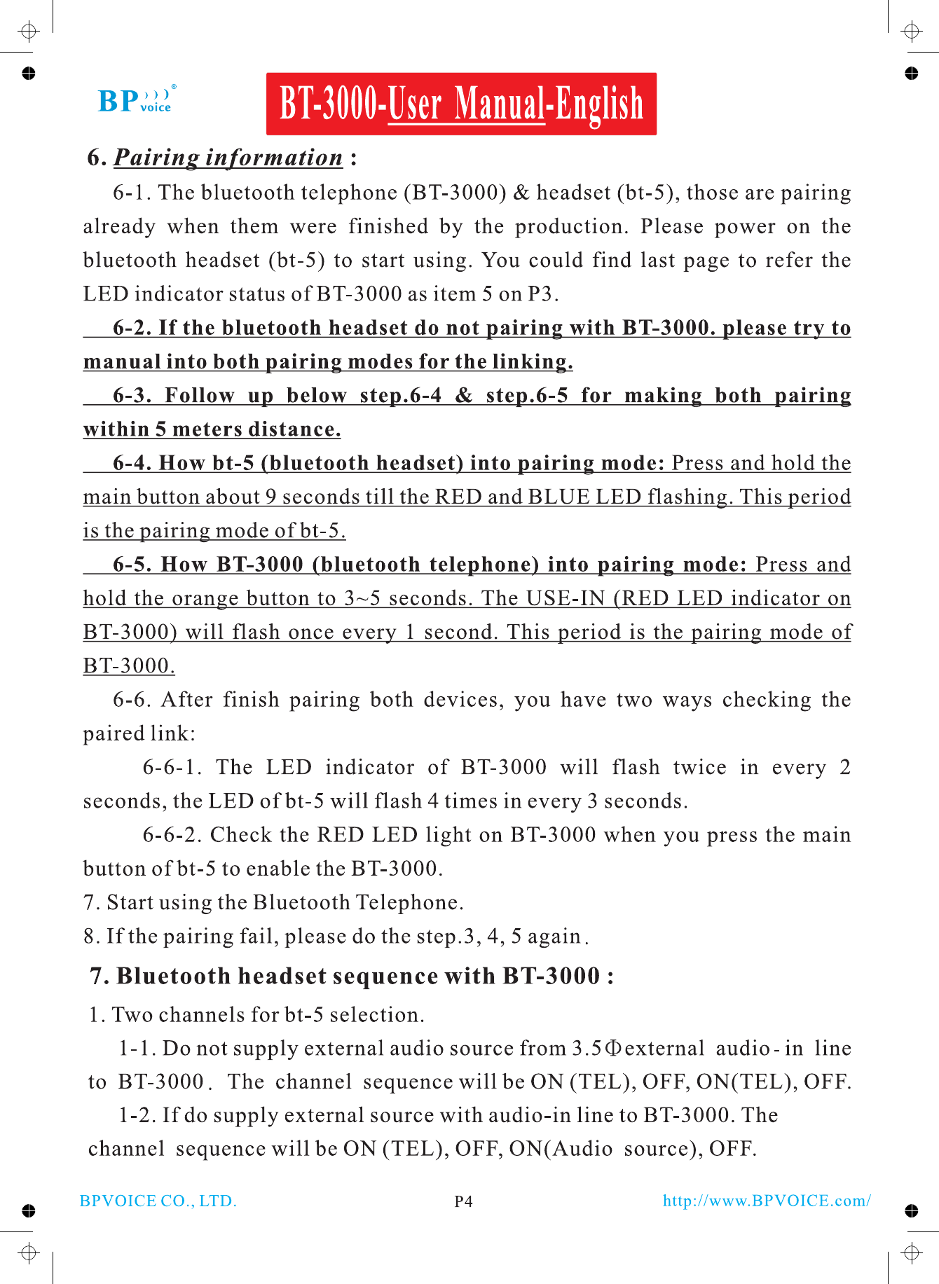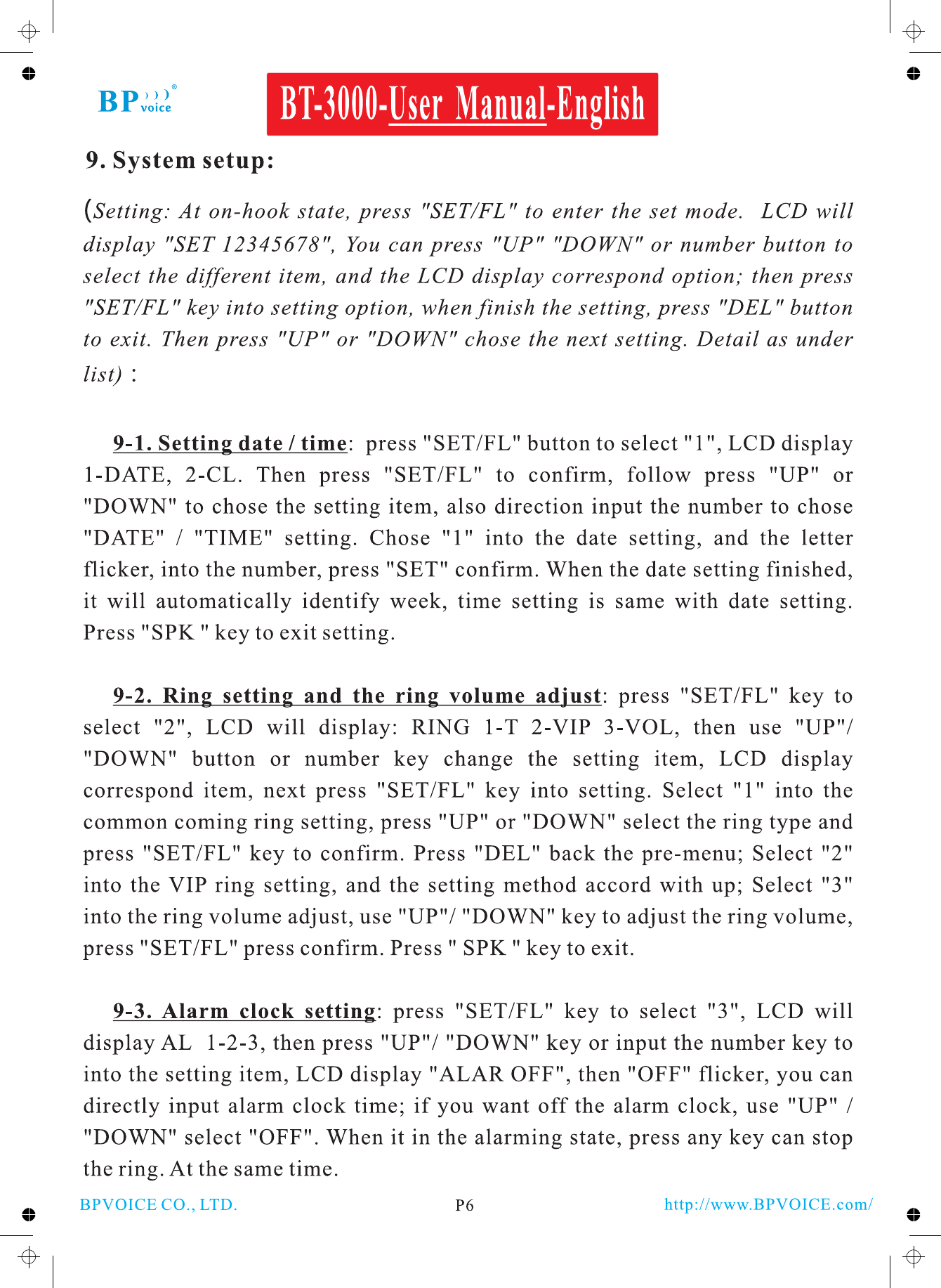 BPVOICE BT-3000 Bluetooth Telephone User Manual
