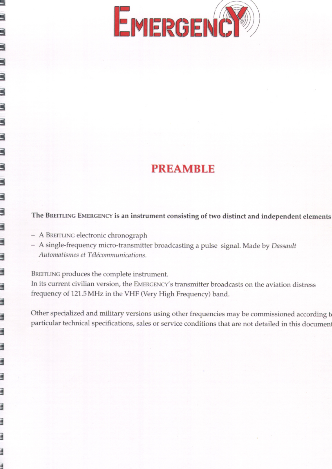 BREITLING USA, INC. Back-up survival instrument intended for use in the event of aviation accident. Part one of eight of the Breitling Emergency