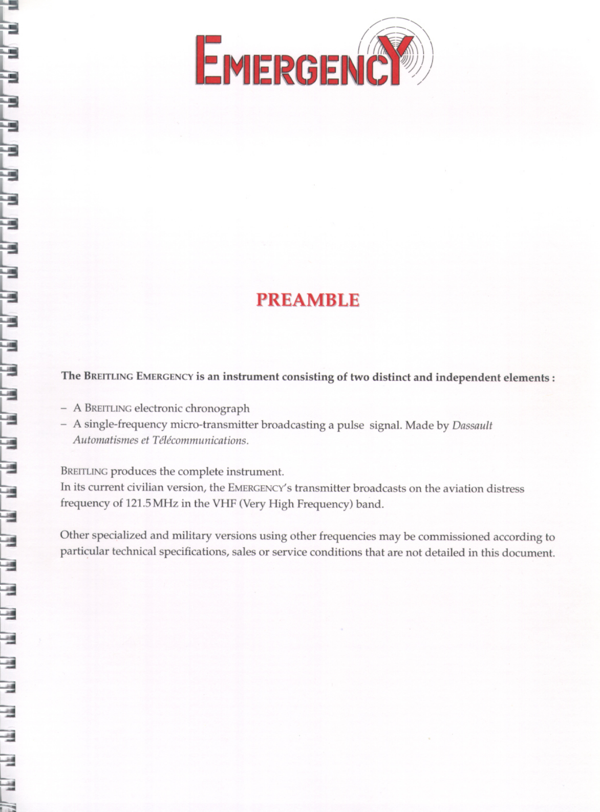 BREITLING USA, INC. Back-up survival instrument intended for use in the event of aviation accident. Part one of eight of the Breitling Emergency