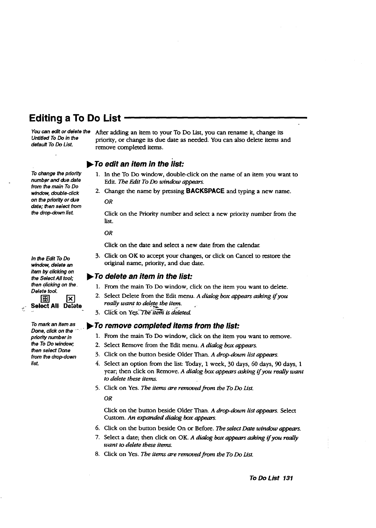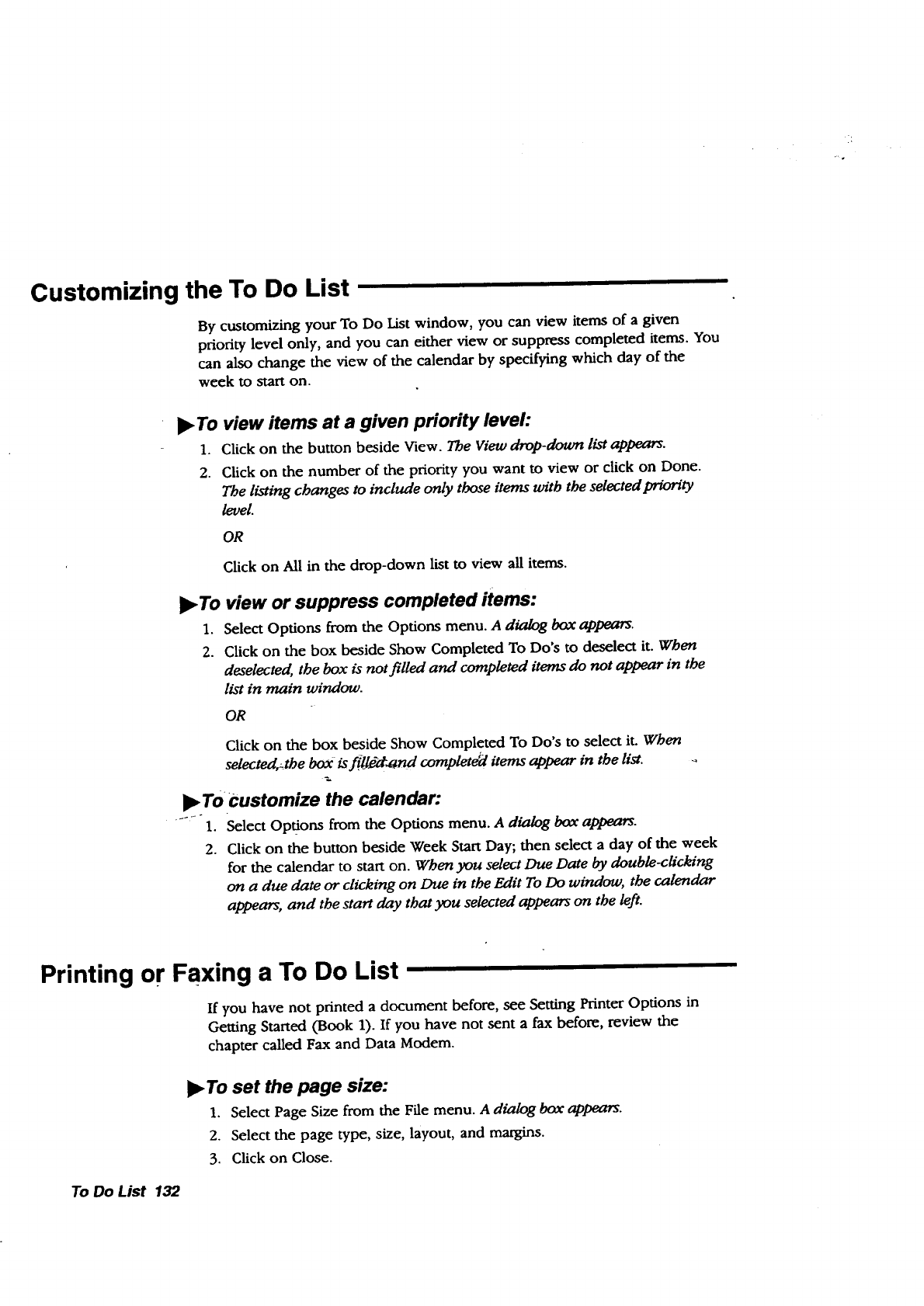 To Do list items, 132