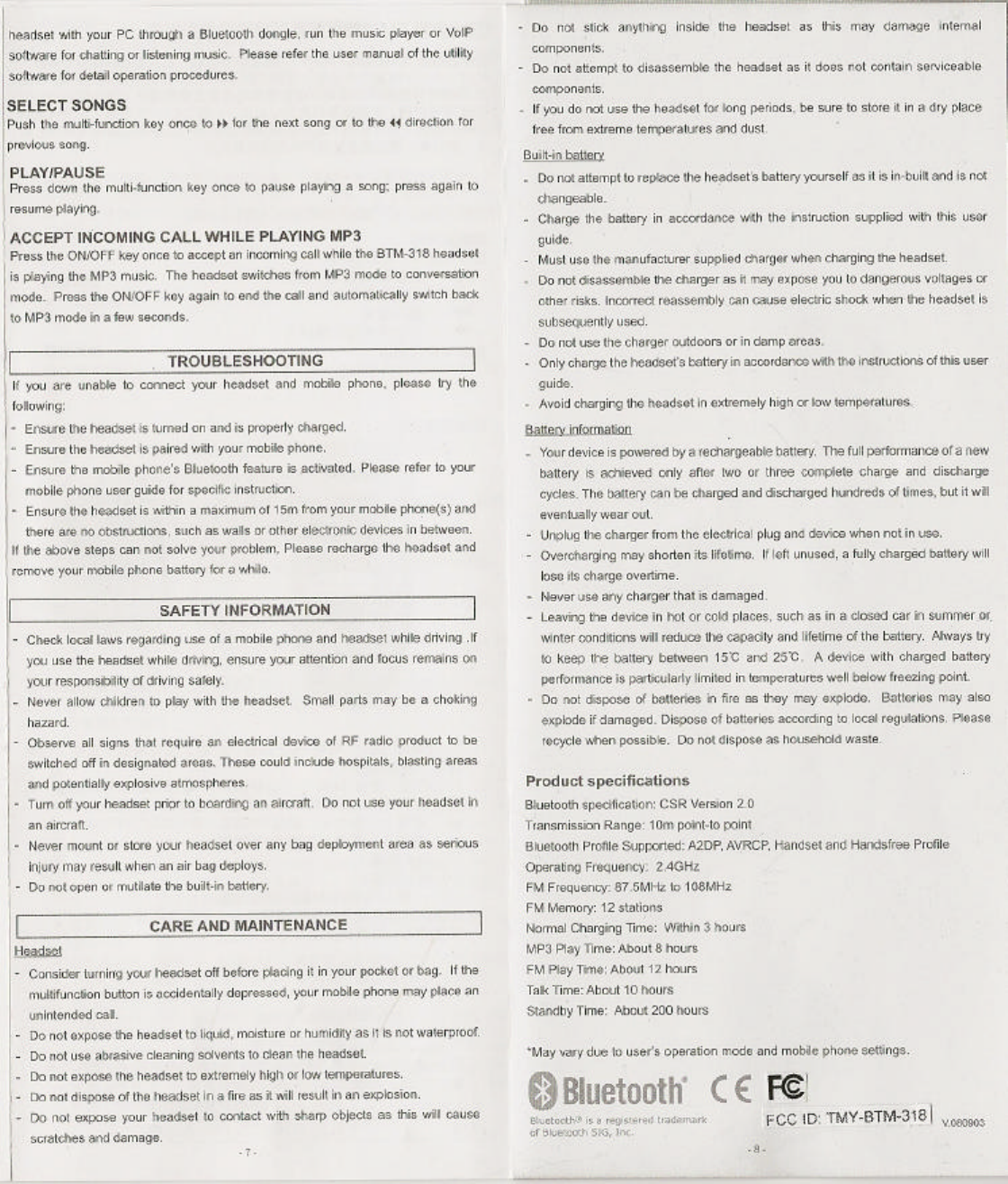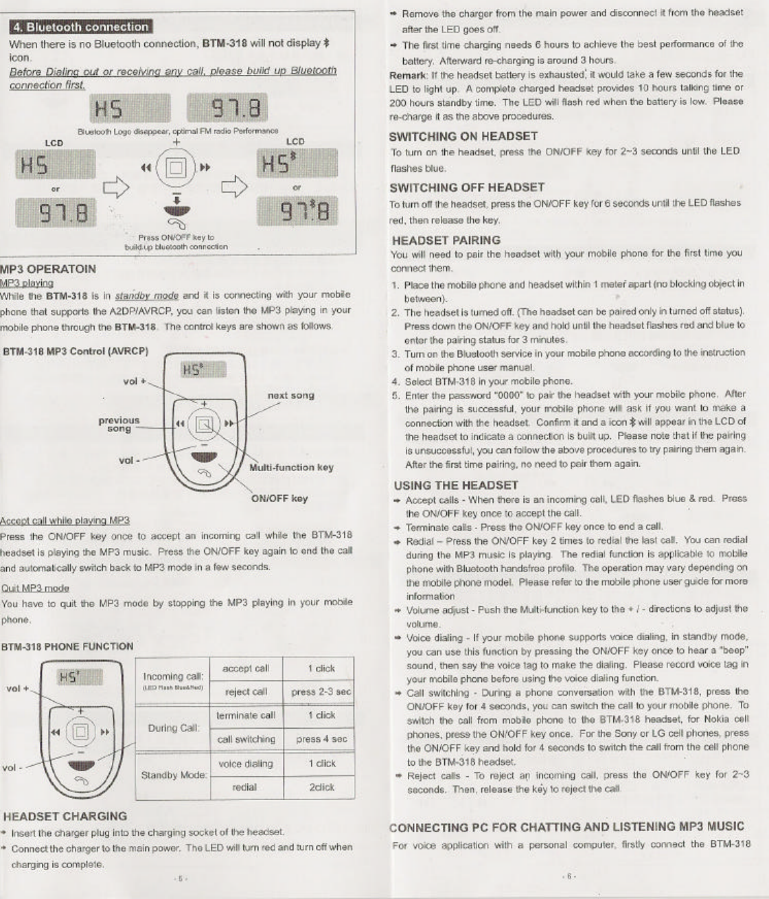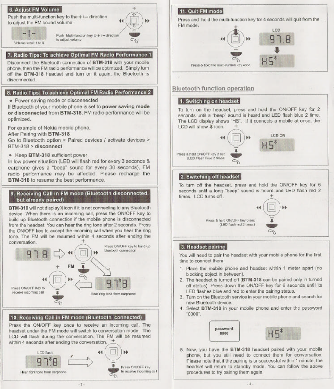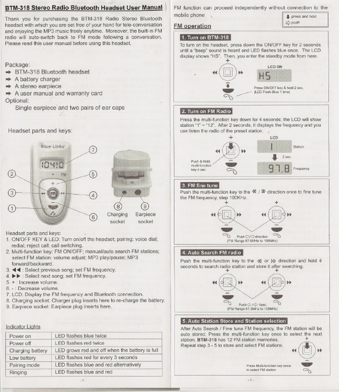 BT Links BTM-318 Stereo Radio Bluetooth Headset User Manual