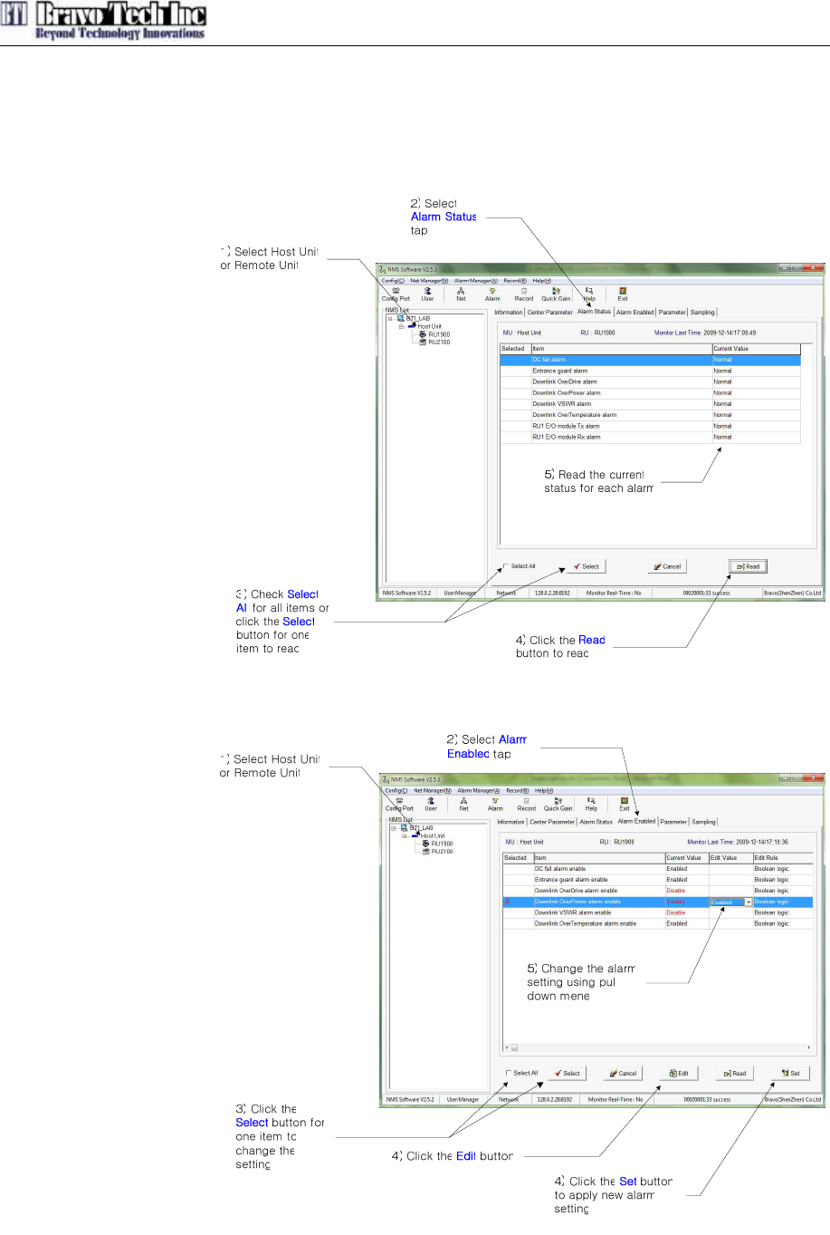 The User can check the current alarm status for Host Unit and Remote Unit with NMS. The Figure