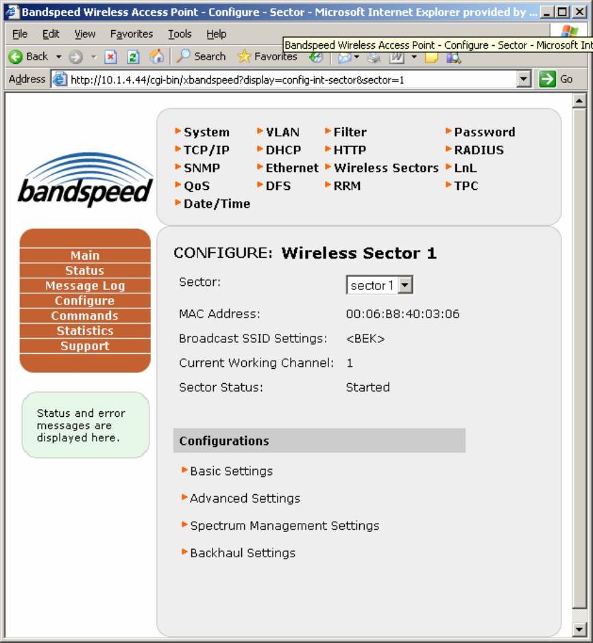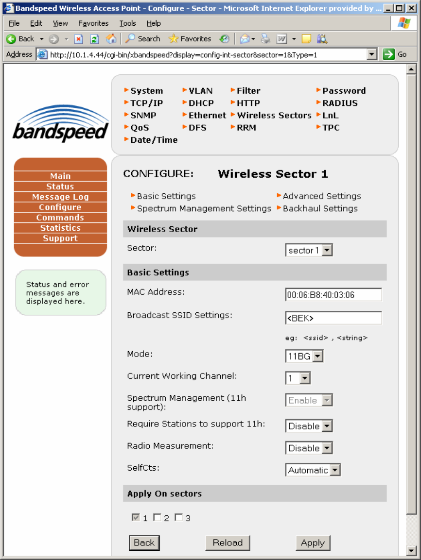 the Wireless Sectors Basic Settings page will appear (below).