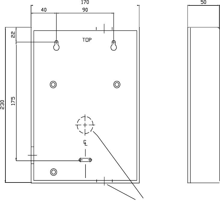keyholes and 1 slotted hole for the 3 fixing screws and a 25mm diameter knock-out hole in