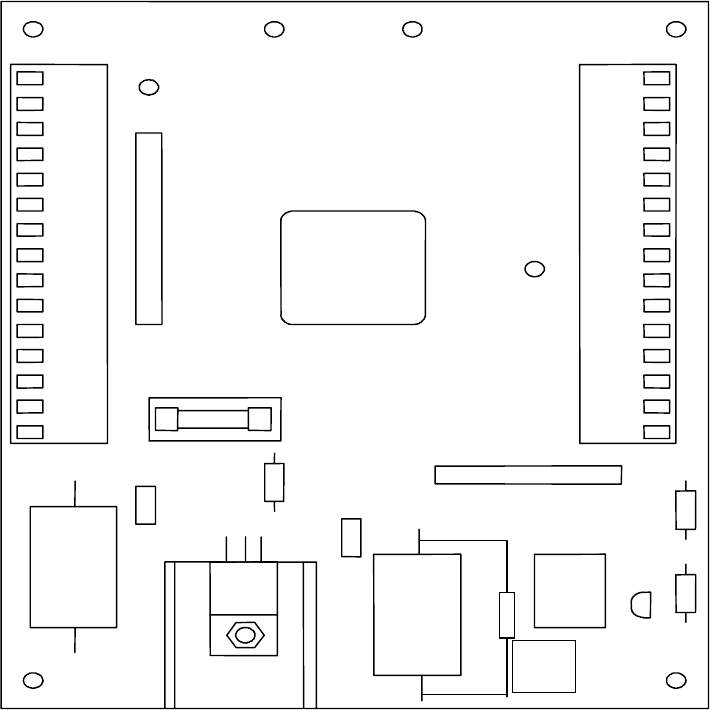 PCB comprises two cable termination blocks, the power supply regulator, 1A fuse, alarm