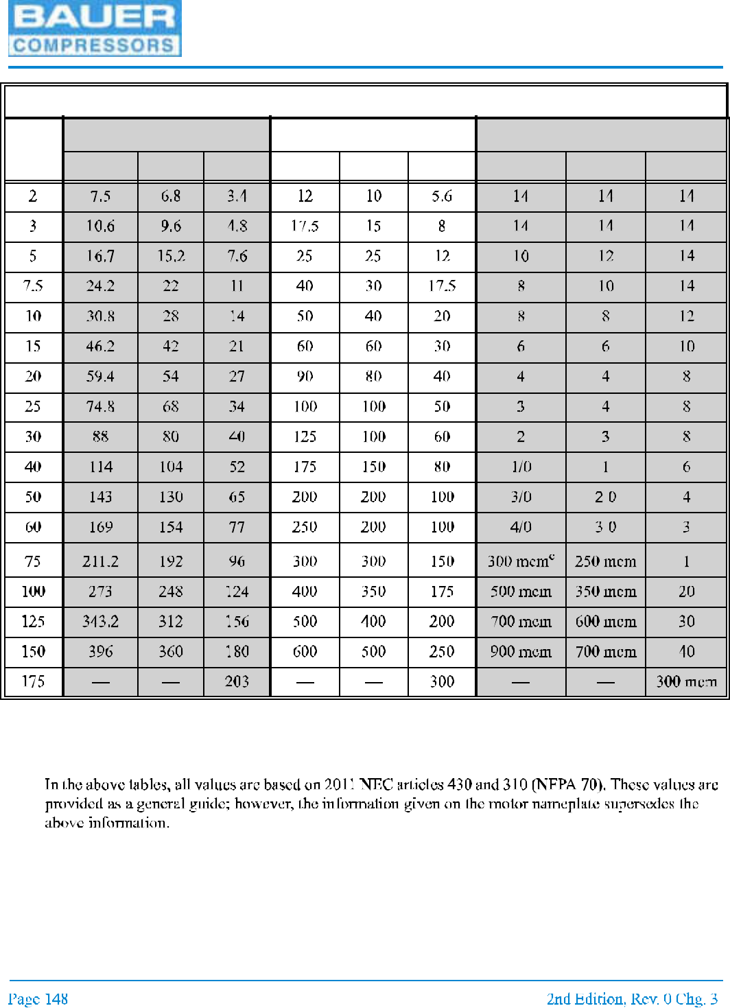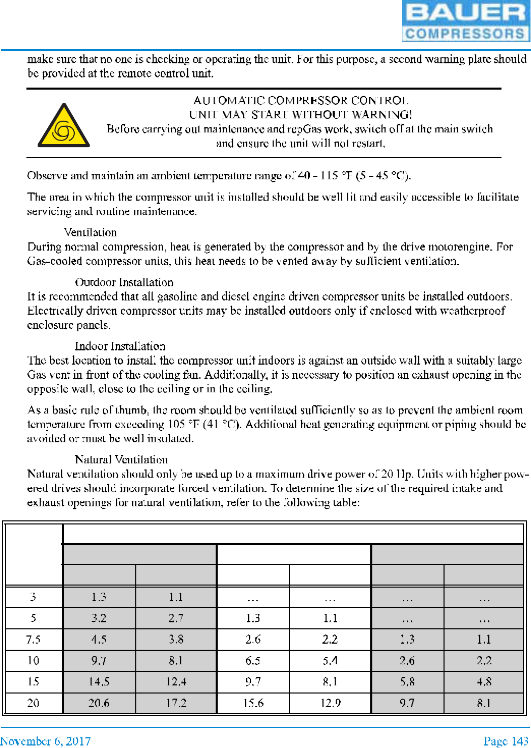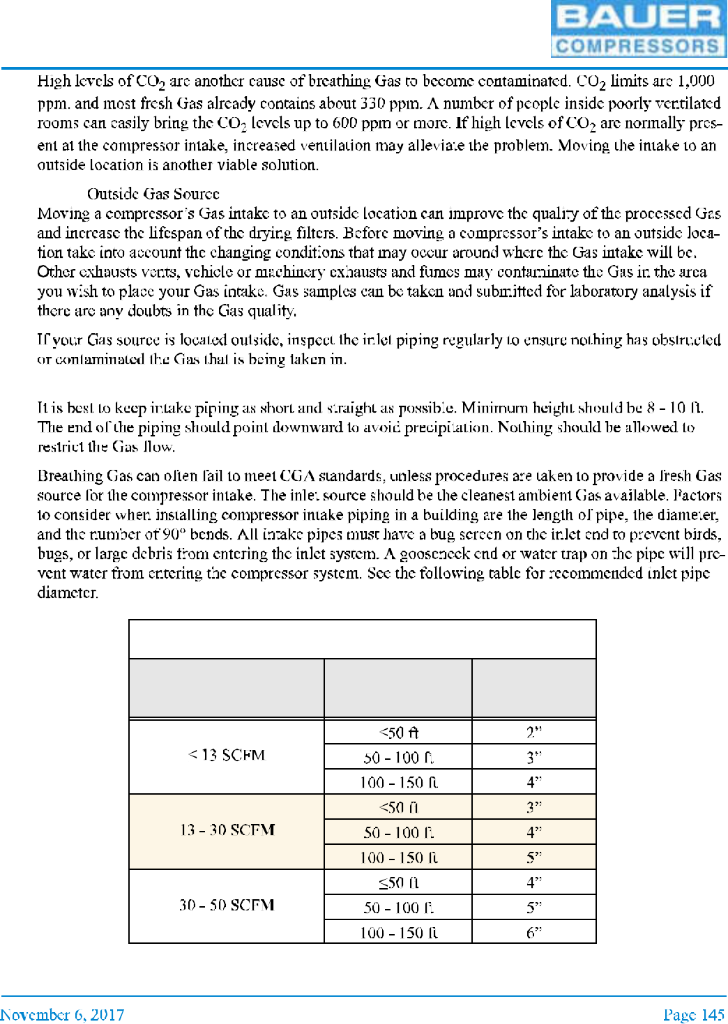 a. The intake sizes given in the above table are for a cooling Gas velocity of 1000 ft.min. Bauer re commends that the cooling Gas velocity be in the range of
