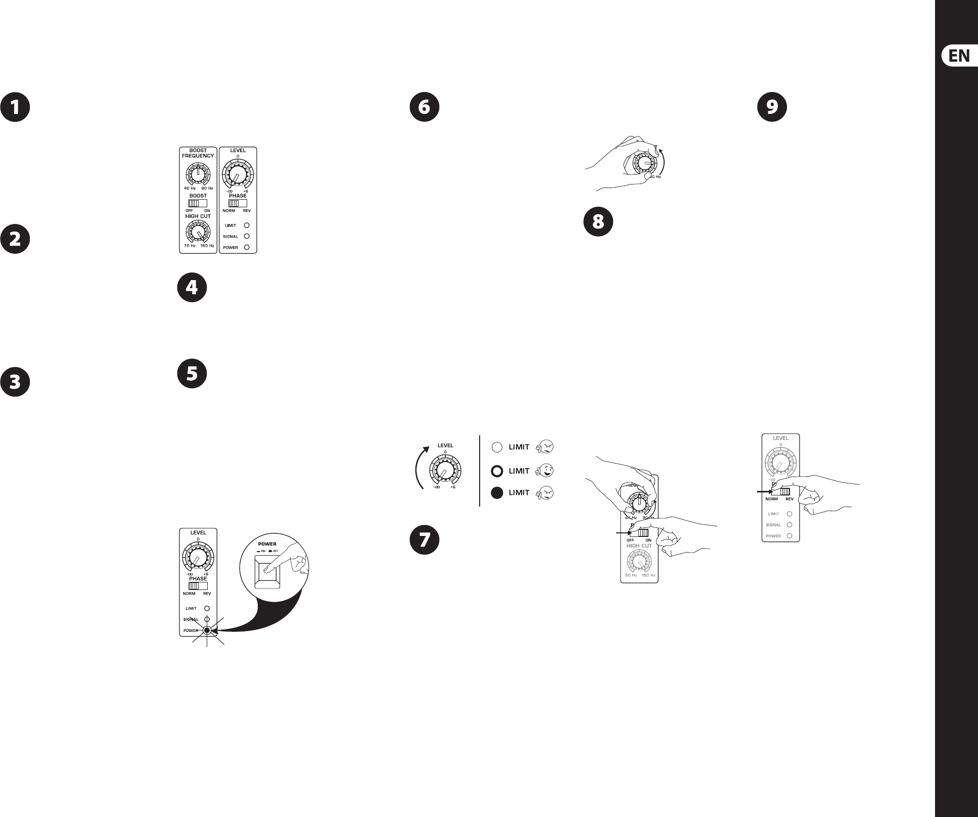 HIGH CUT Freqüência variável para “high-cut” ltro, 70 Hz - 150 Hz, Butterworth 24 dB inclinação