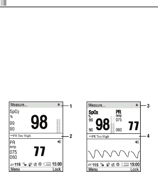 Alarm: SpO2% and pulse rate value, probe off, battery exhausted