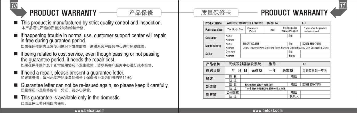 Belcat T-1 WIRELESS TRANSMITTER User Manual 15 T 1 UserMan