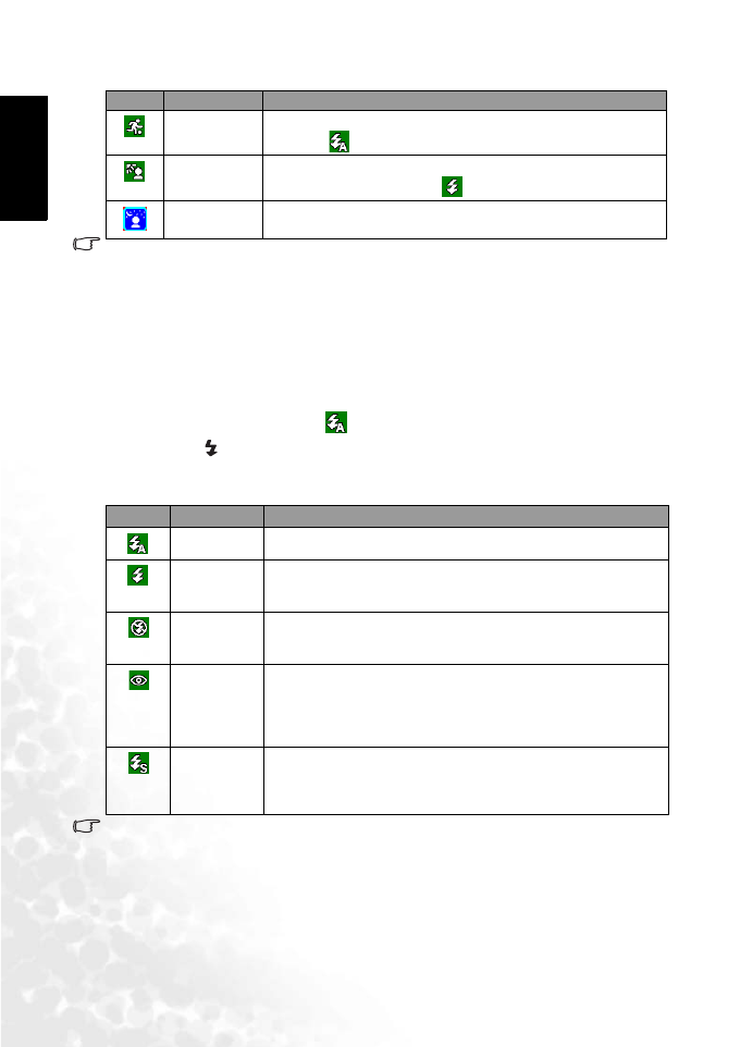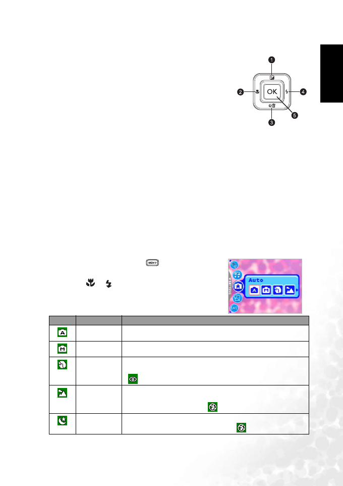 Flash Modes: Auto/Forced flash/Red-eye reduction/Flash off/Slow Sync