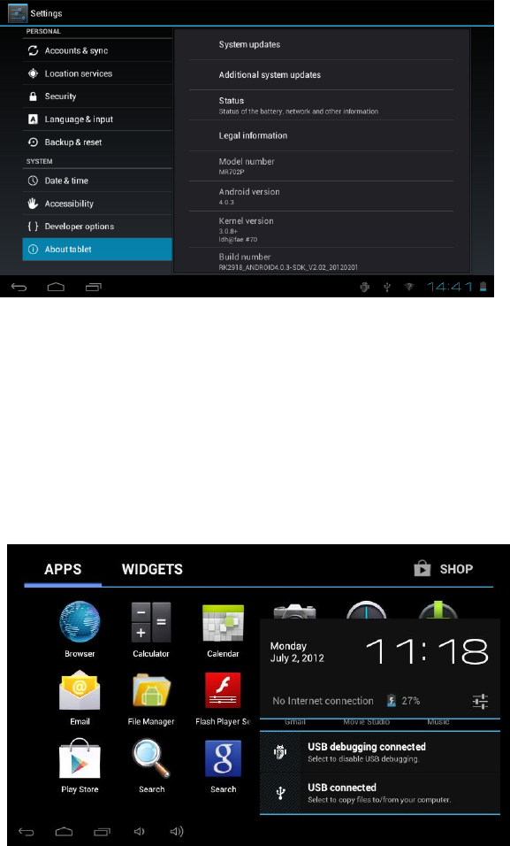6-11. About Tablet PC: view the status of the machine, power usage state, legal information, model and version