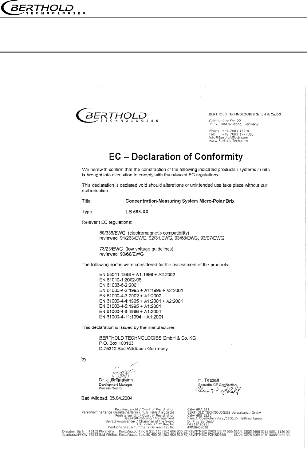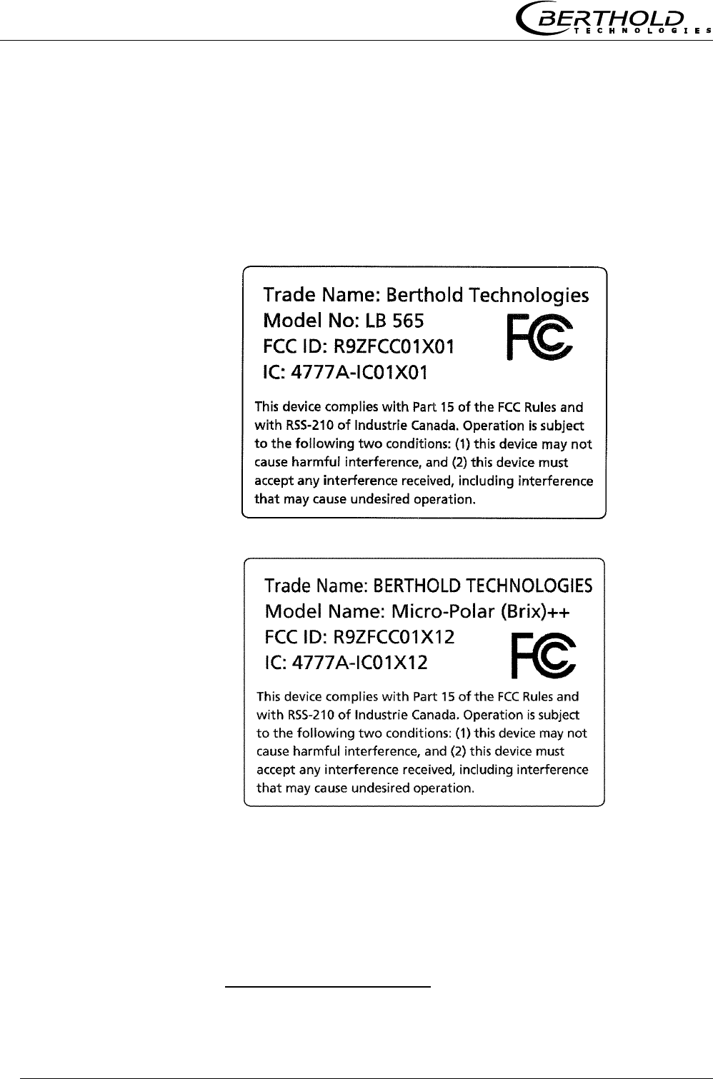 The units supplied should not be repaired by anyone other than Berthold Technolo-