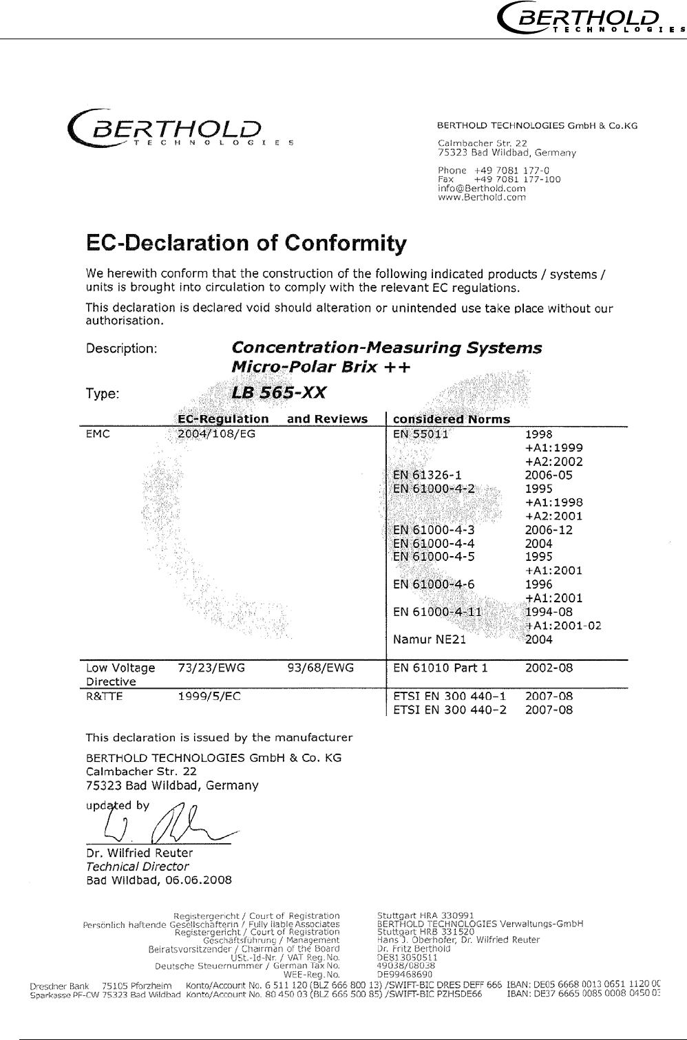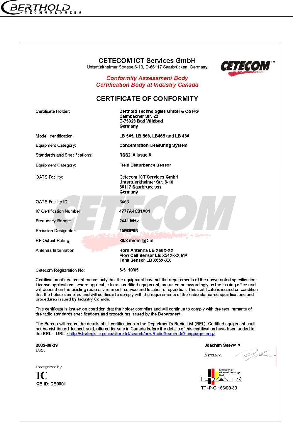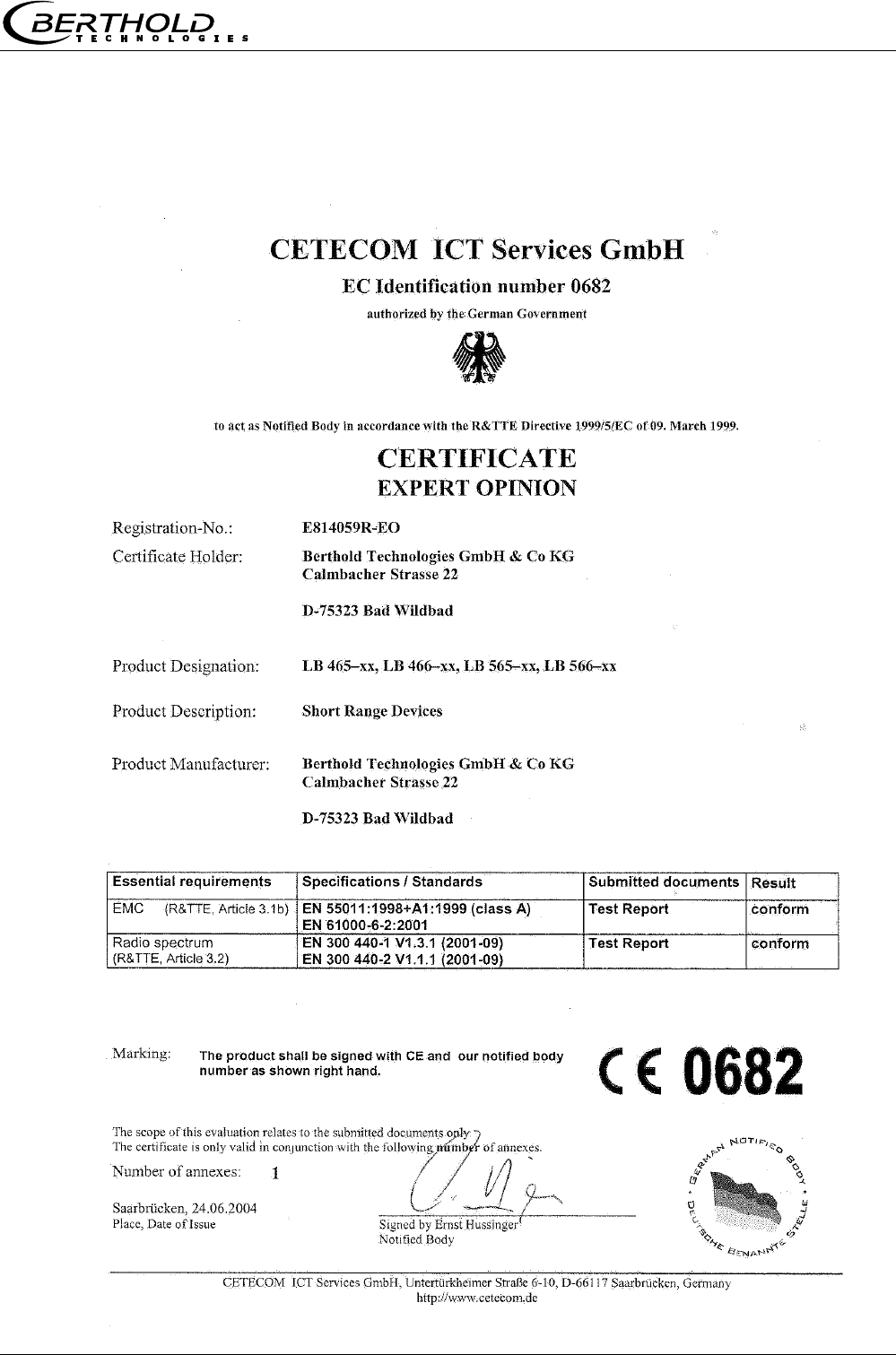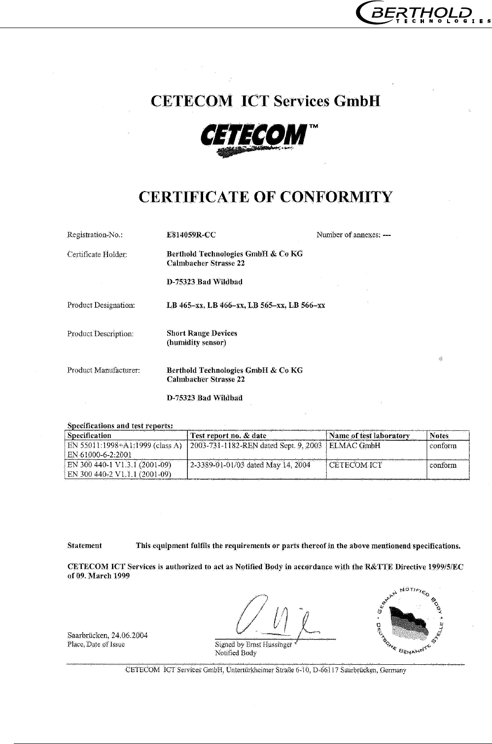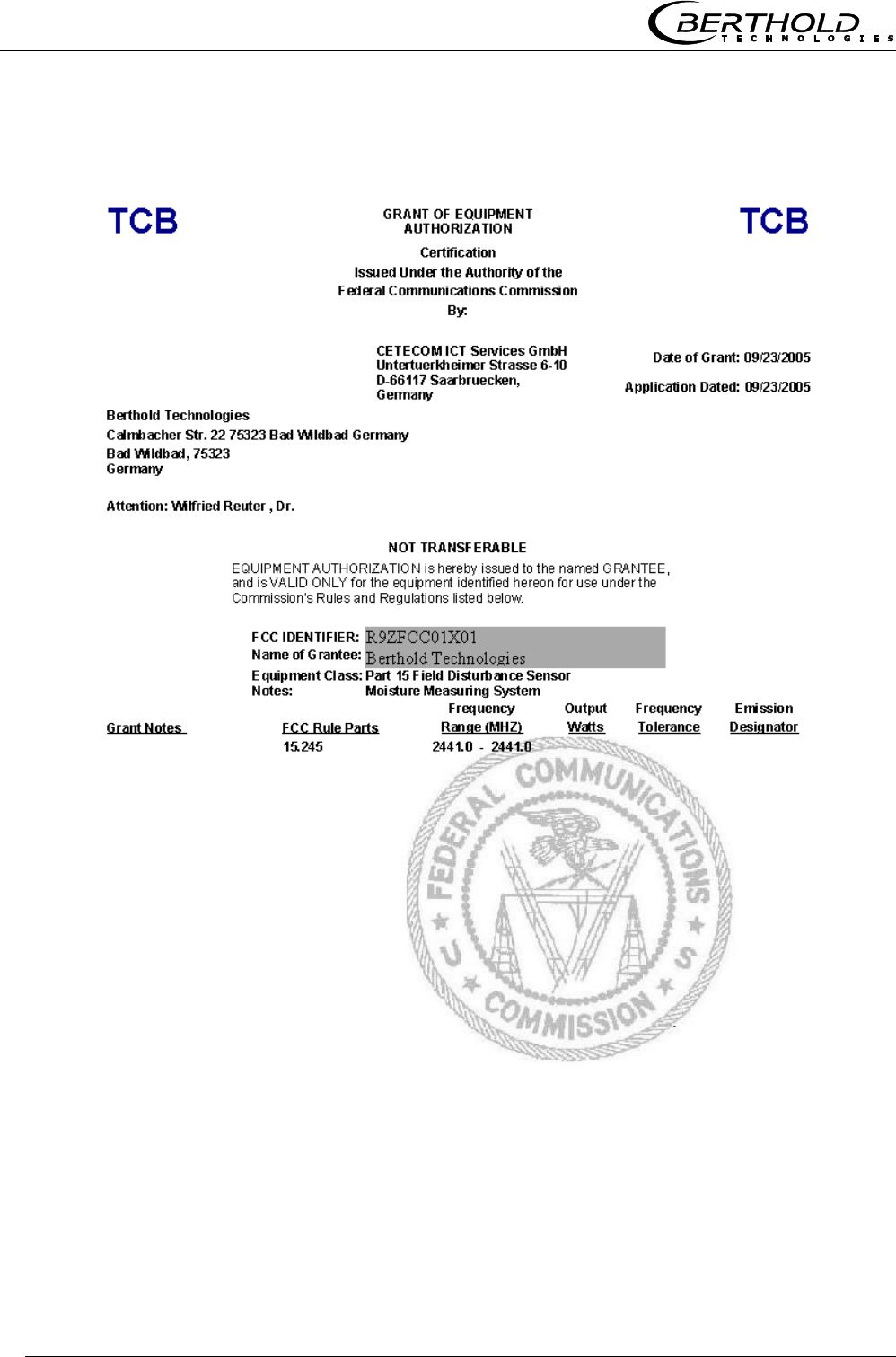 Berthold Technologies FCC01X12 Concentration, Dry, Mass, Water measuring system User Manual 39531BA2 04CETECOM HW