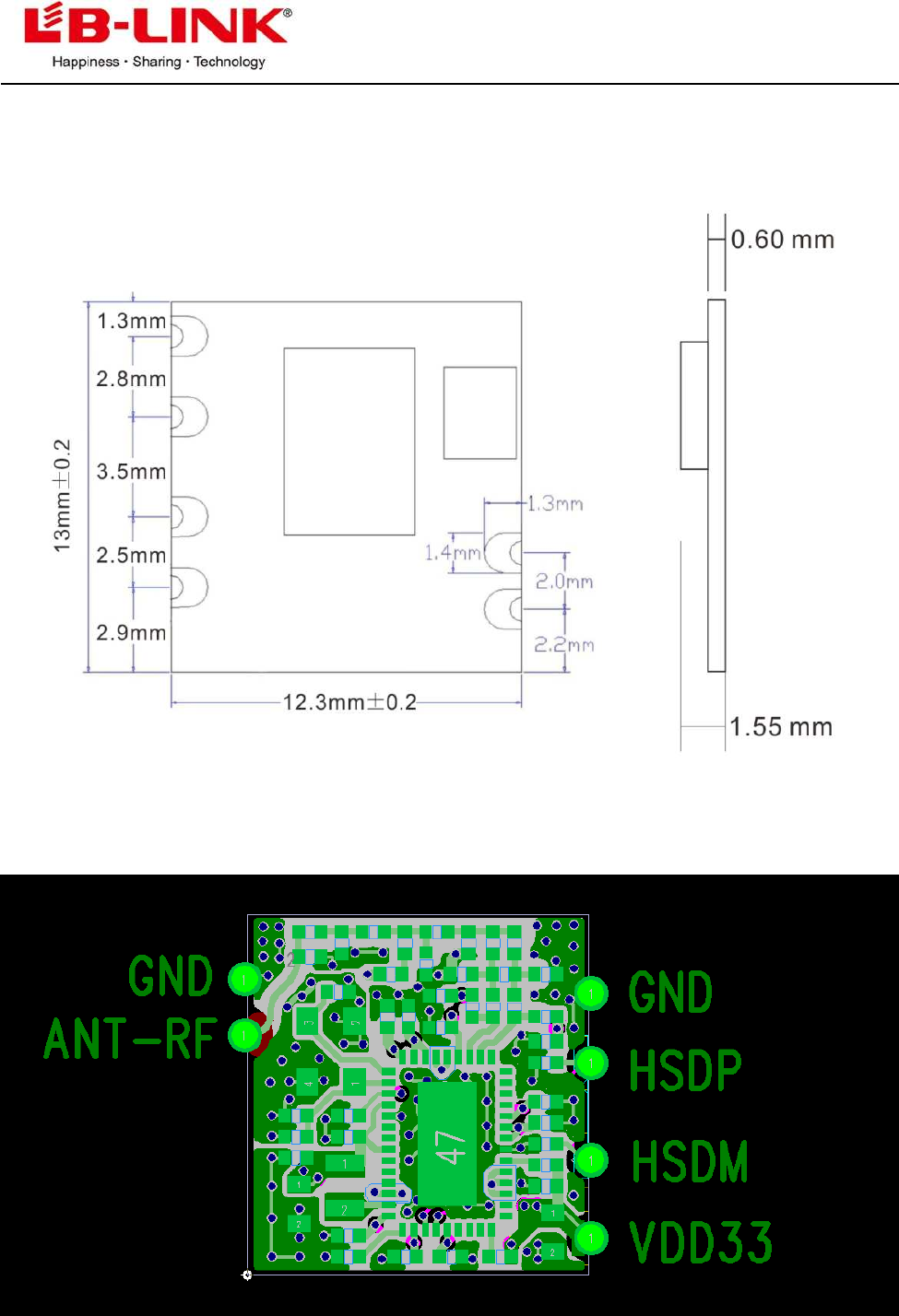 Module dimension: Typical (L x W x H): 13mmx12.3mmx1.55mm Tolerance : +/-0.2mm