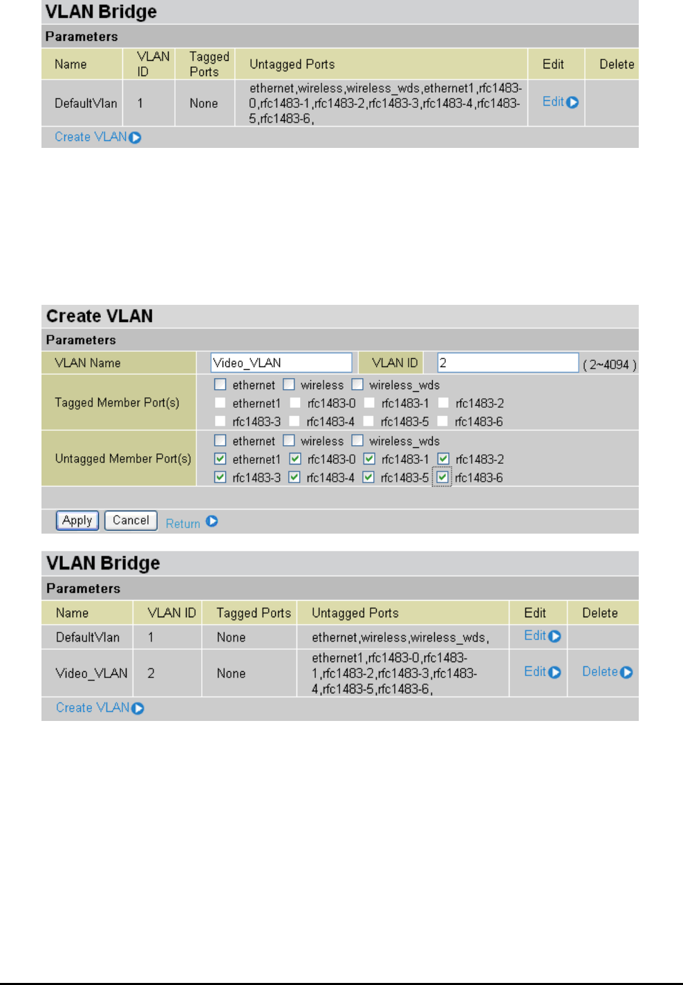 VLAN untagged ports for Video: ethernet1, rfc-1483-0 ~ rfc-1483-6.