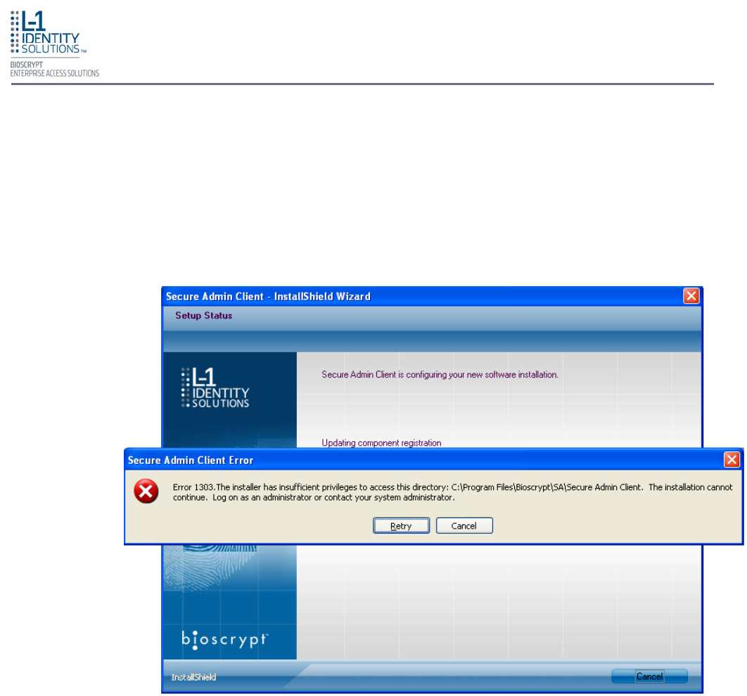 “Finish”). If it occurs, it means that the user does not have sufficient rights to install