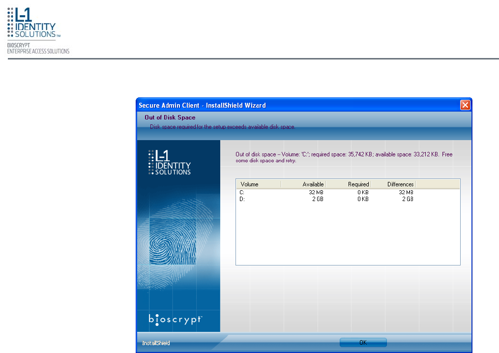 Client on does not have sufficient hard drive space. Install a larger hard drive or install