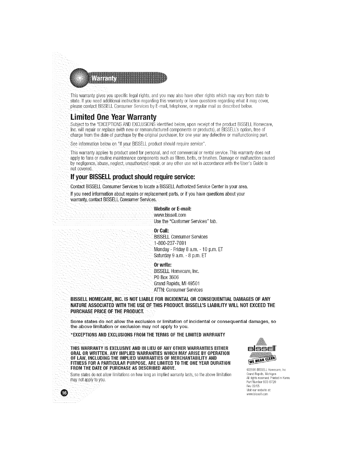 warranty,contactBISSELLConsumerServices.