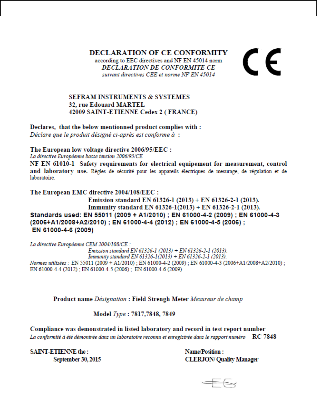 environmental conditions restrict the specifications of your Field Strength Measurer (MDC). SEFRAM checks the characteris-