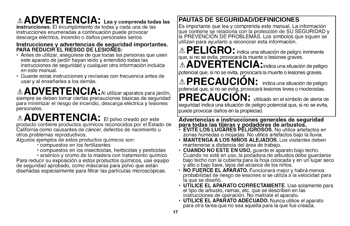 shrub, growth, etc., described in the operating instructions. Do not