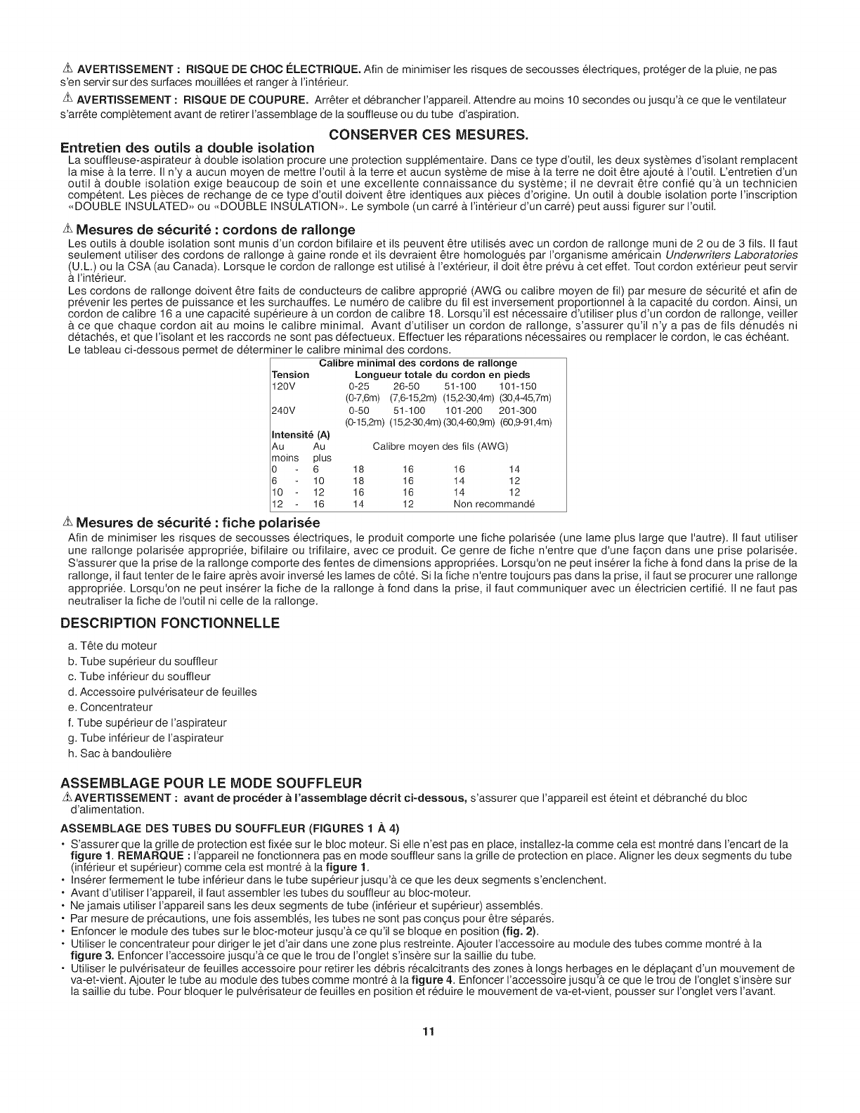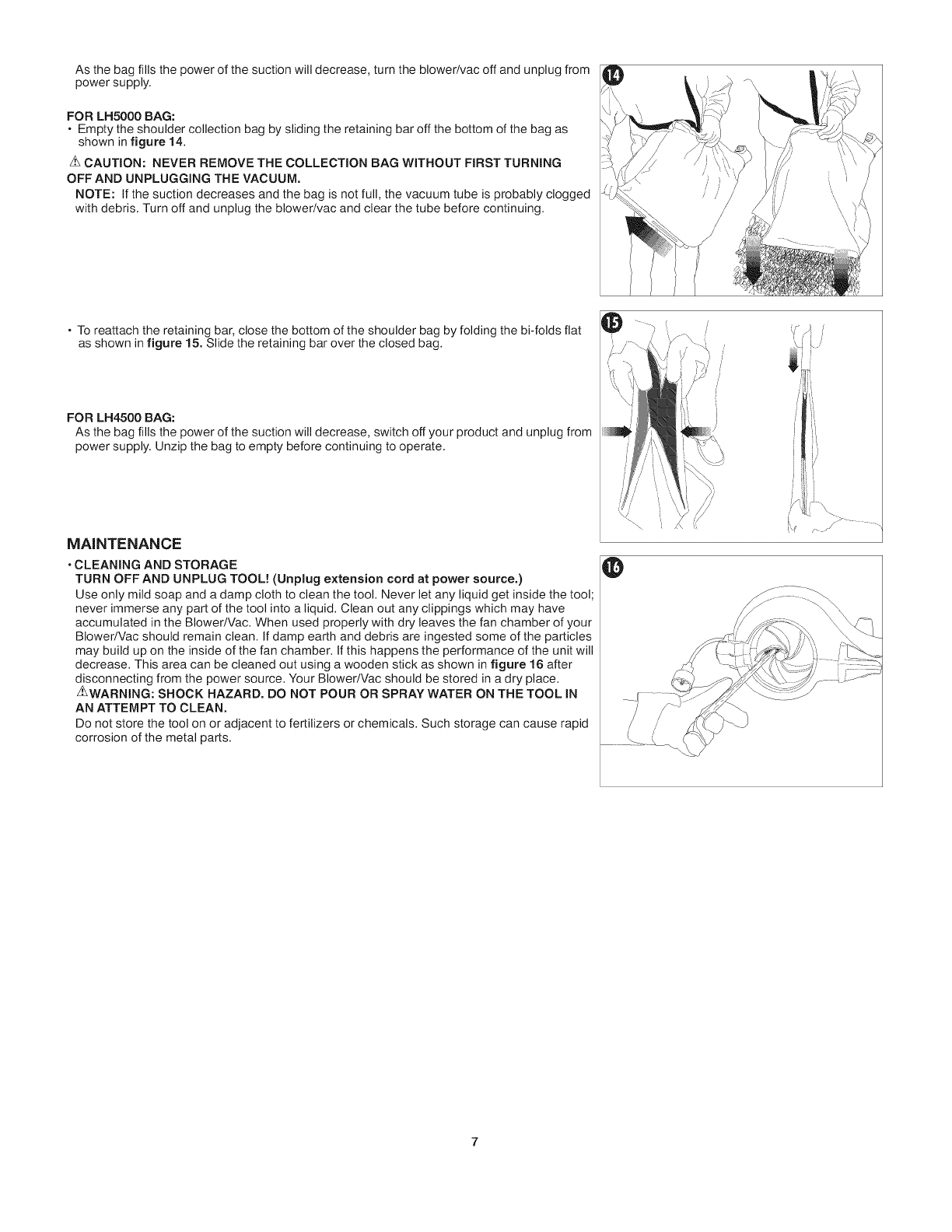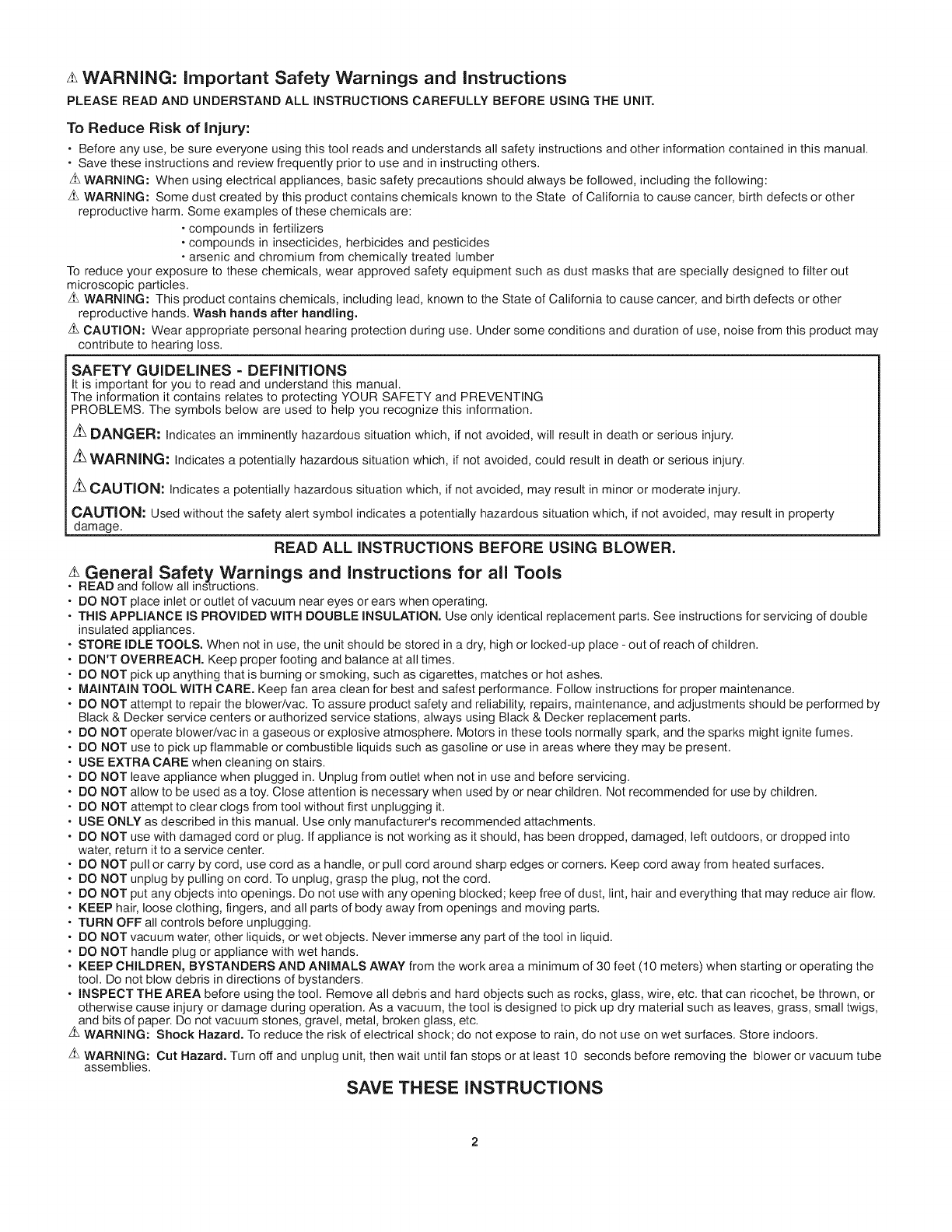 • DO NOT attempt to repair the blower/vac. To assure product safety and reliability, repairs, maintenance, and adjustments should be performed by