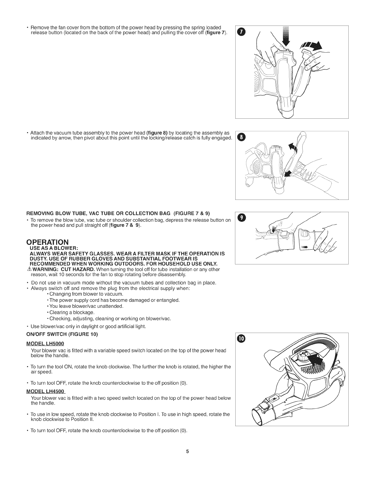 WARNING: Cut Hazard, Turn off and unplug unit, then wait until fan stops or at least 10 seconds before removing the blower or vacuum tube