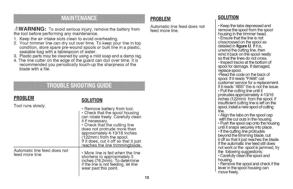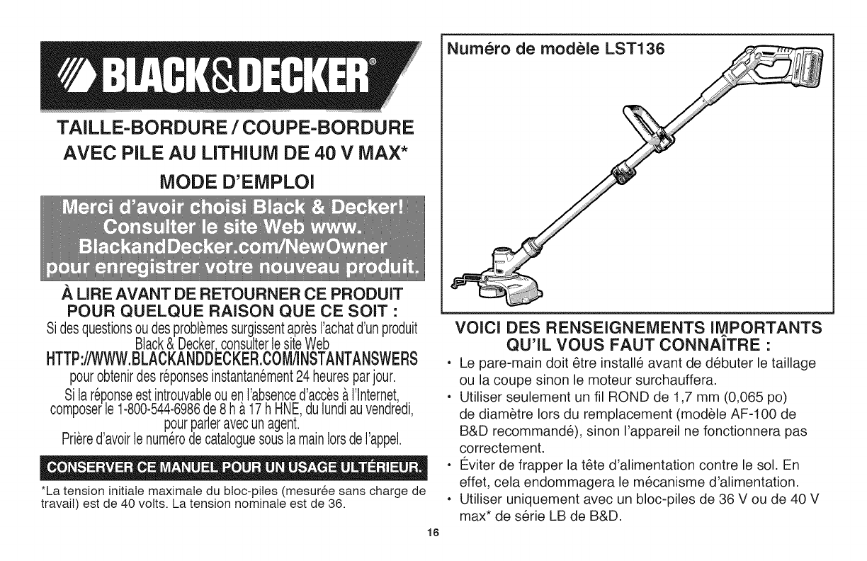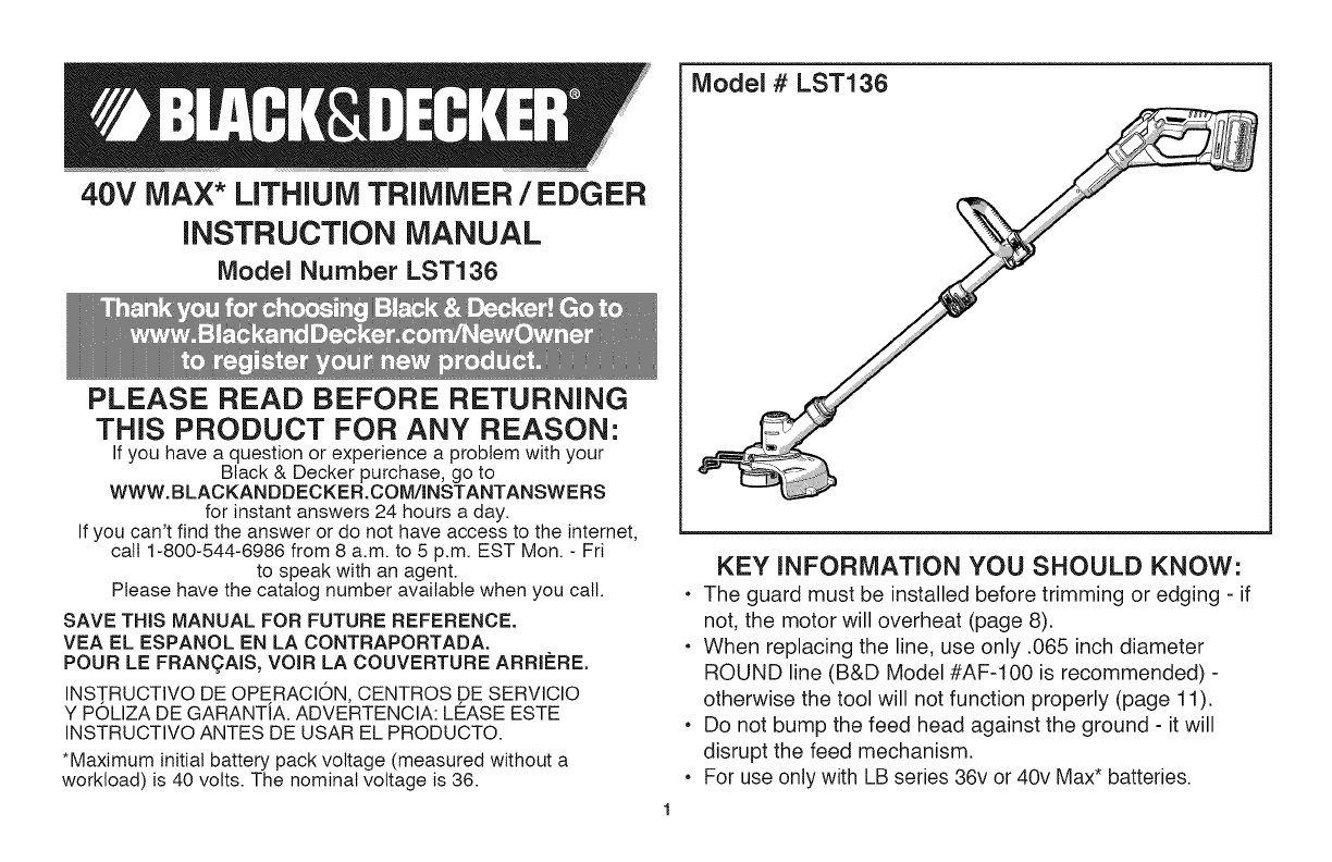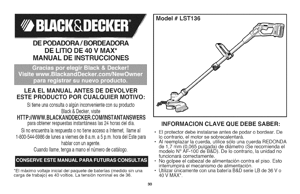 User Manual: Black & Decker LST136 TYPE 2 LST136 TYPE 2 BLACK & DECKER TRIMMER - Manuals and Guides View the owners manual for your BLACK & DECKER TRIMMER #LST136TYPE2. Home:Lawn & Garden Parts:Black&Decker Parts:Black&Decker TRIMMER Manual