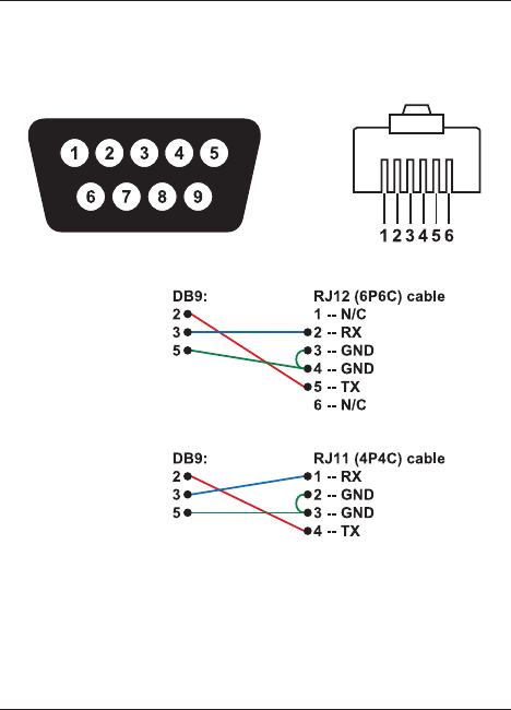 Figure A-1 shows the DB9 to RJ-12 or RJ-11 connector pinouts.
