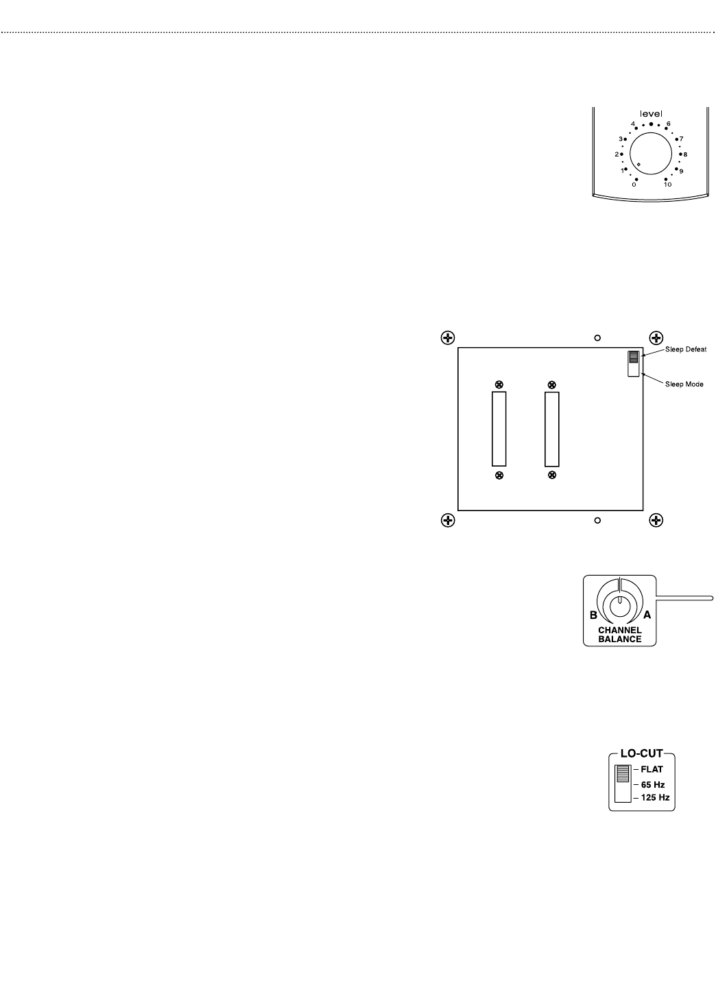 adjusted by the "B" Level Control. Set the Lo-Cut switch to Flat or 65Hz. Channel Balance control on rear of ampli-