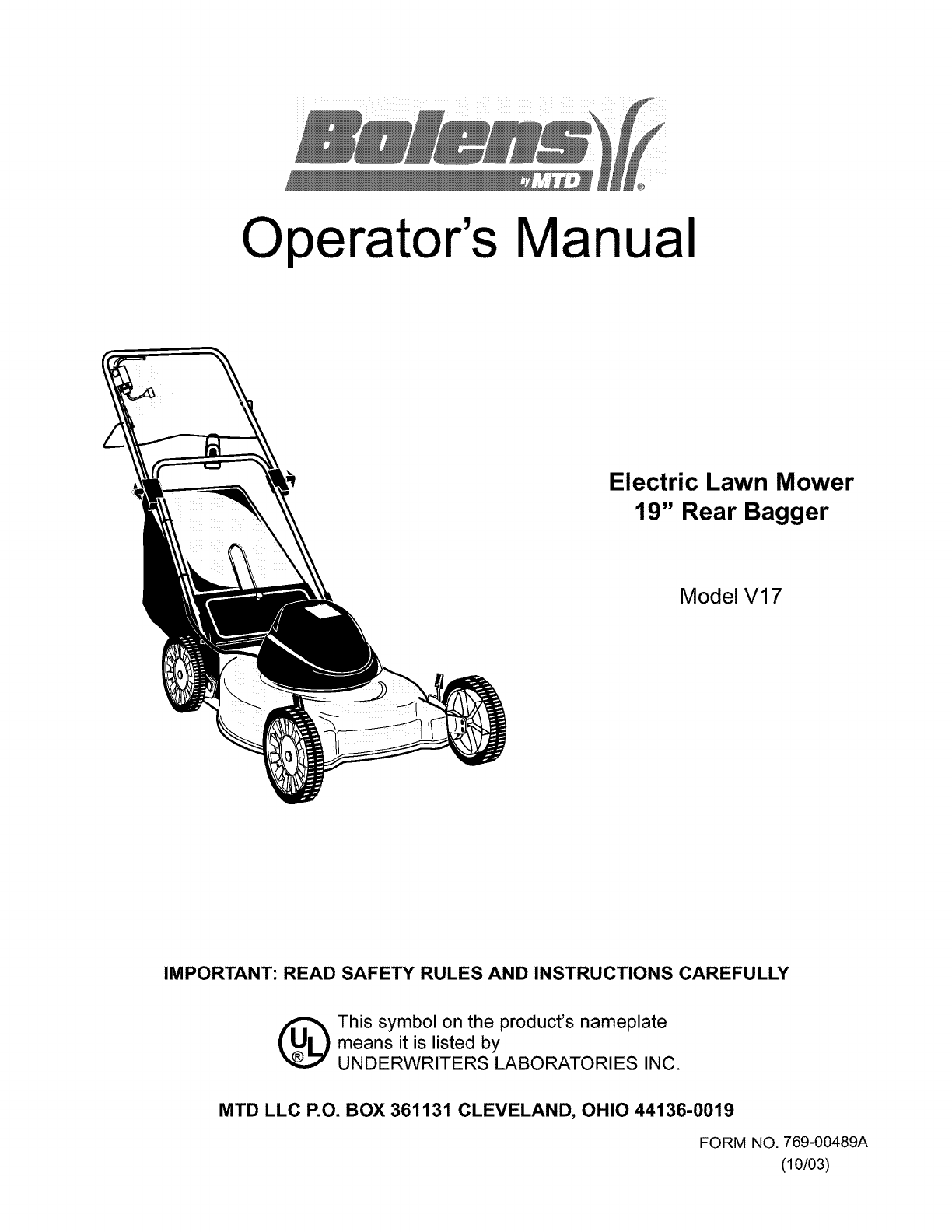 User Manual: Bolens 18A-V17-765 18A-V17-765 BOLENS ELECTRIC MOWER - Manuals and Guides View the owners manual for your BOLENS ELECTRIC MOWER #18AV17765. Home:Lawn & Garden Parts:Bolens Parts:Bolens ELECTRIC MOWER Manual