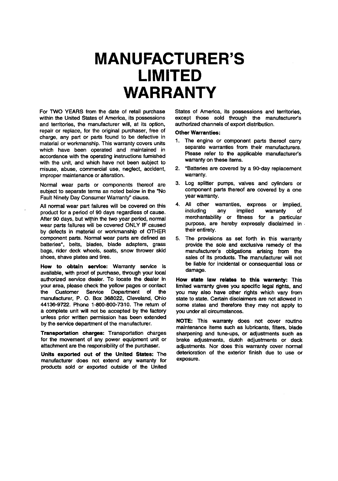 service dealer or contest the service department, P.O. Box 368022 Cleveland, Ohio 44136-9722.