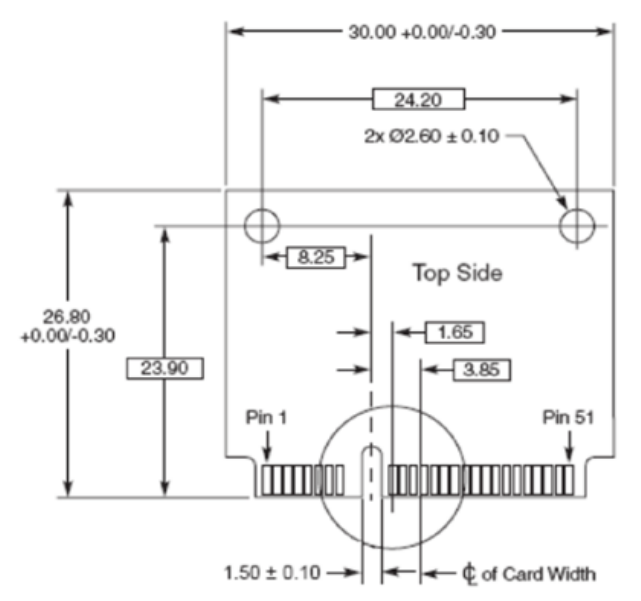 Module has dimensions of a PCIE mini card, with 1mm nominal thickness. See below for dimensions.