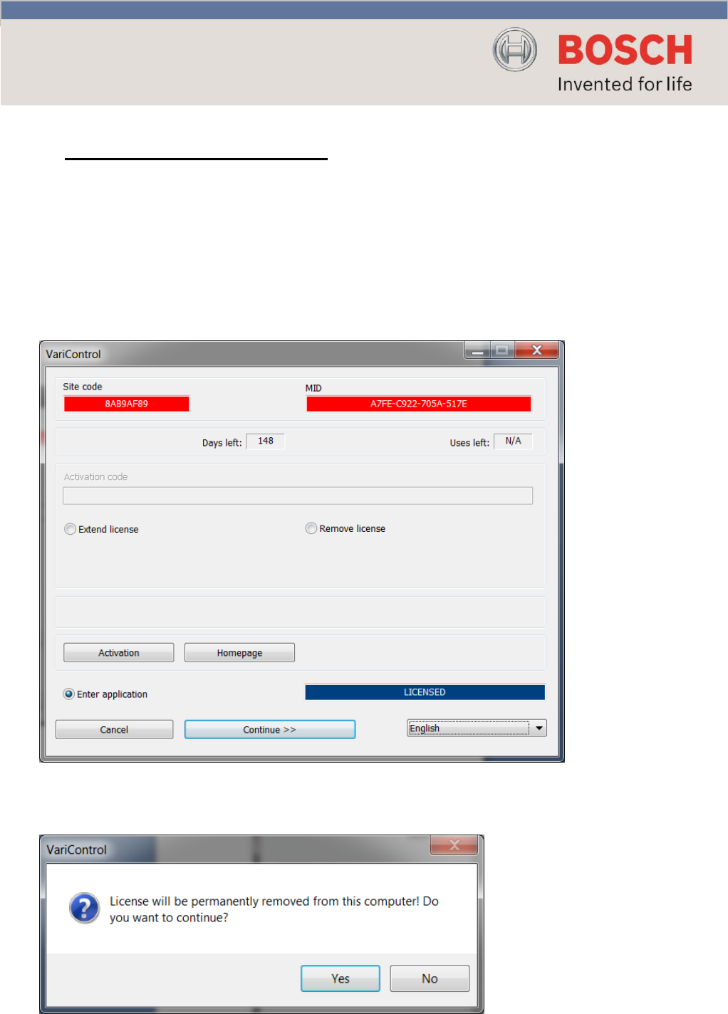 Mark the Remove license radio button, fill in the Activation code and press “Continue >>”.
